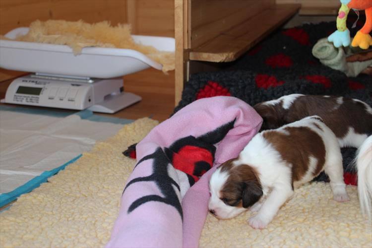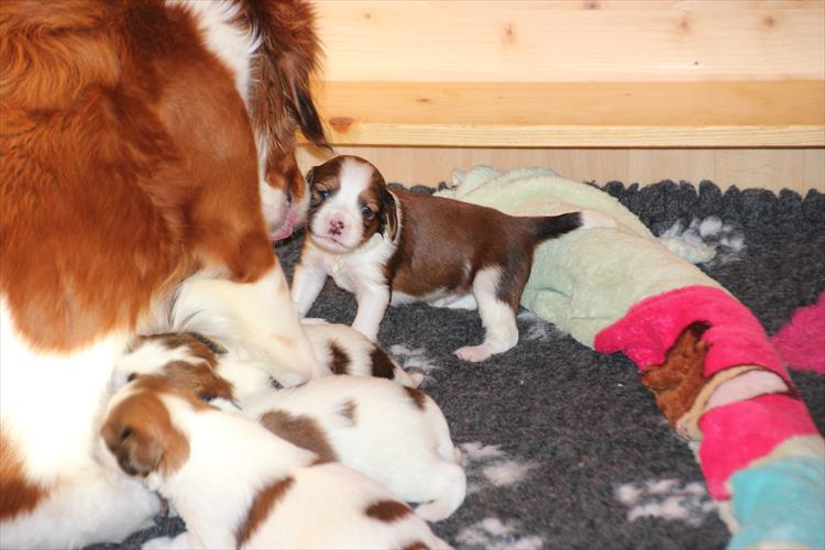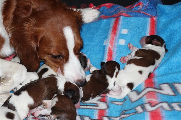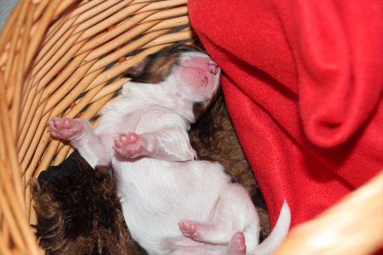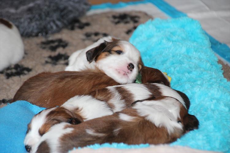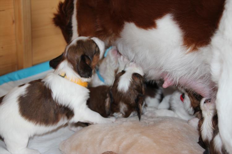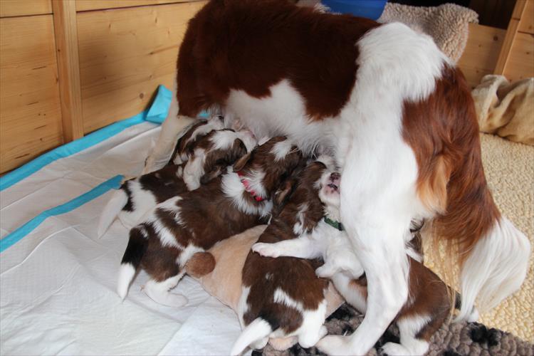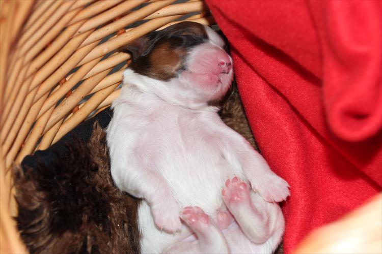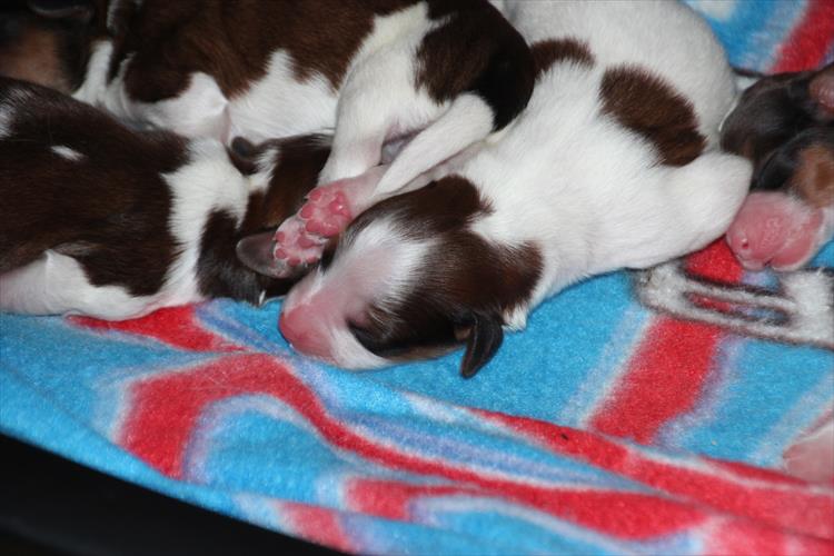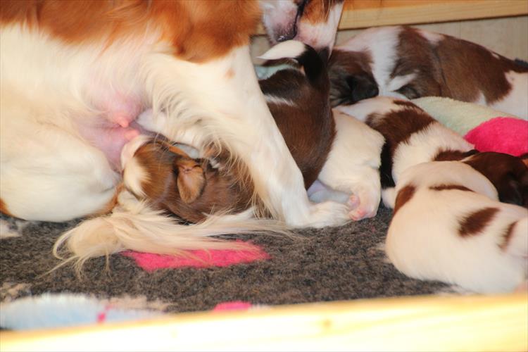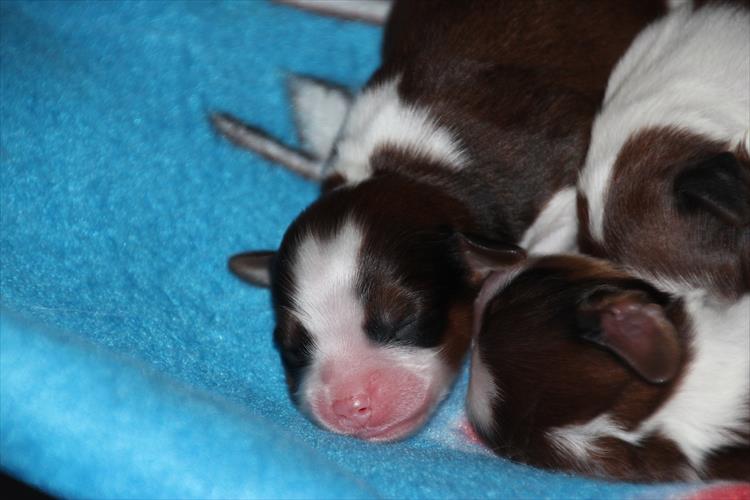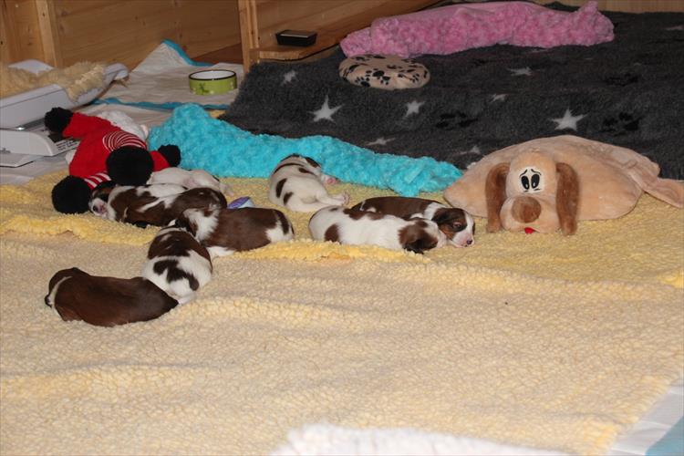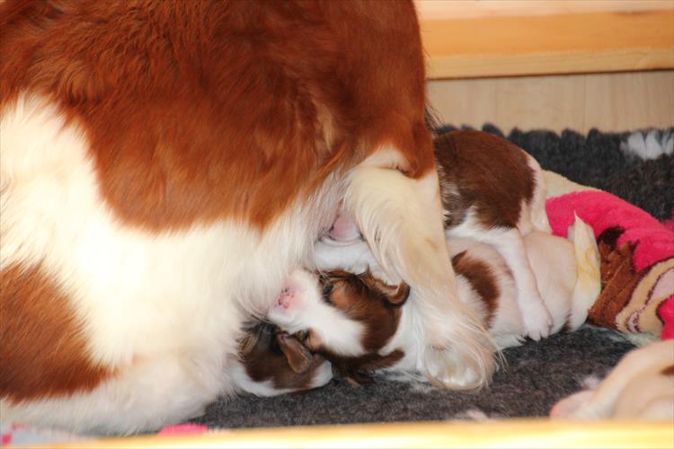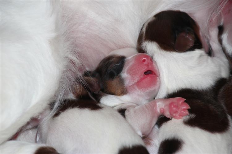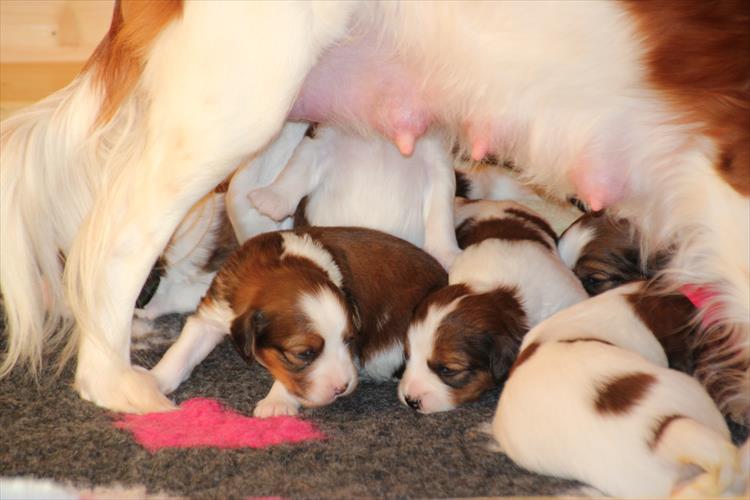 Die Welpen befinden sich in der Neonatalen Phase (die ersten 14 Tage). Sie sind Nesthocker und in den ersten Lebenswochen absolut abhängig von der mütterlichen Fürsorge. Ohne diese können sie nicht überleben. Dreamy verlässt die Welpenbox noch sehr selten und ist um die Welpen sehr bemüht. Die kleinen Welpen sind nach der Geburt noch taub und blind. Augen und Gehörgänge sich noch verschlossen. Die Kleinen sind noch nicht in der Lage ihre eigene Wärme zu regulieren. Sie verfügen über einen Wärmesinn, Tastsinn und einen eingeschränkten Geruchssinn. Durch typische Pendelbewegungen des Kopfes suchen sie die Zitzen. Die Wärmesensoren befinden sich im Kopfbereich. Sie können sehr genau warm und kalt unterscheiden. Wird es den Welpies zu kalt, bewegen sie sich reflexartig, bis sie die Mutter oder andere Geschwister gefunden haben. Sie können noch nicht selbstständig Kot und Urin absetzen. Durch das Lecken der Mutter am Bauch und im Genitalbereich wird die Verdauung angeregt. Die Welpen schlafen jetzt 16 bis 20 Stunden.