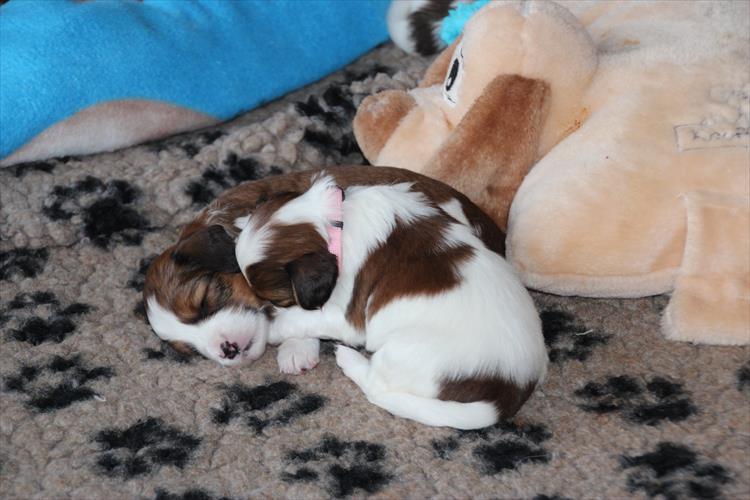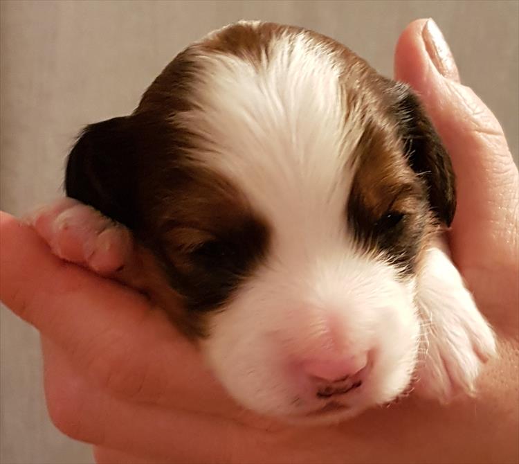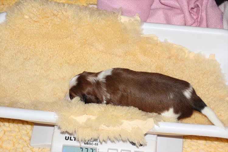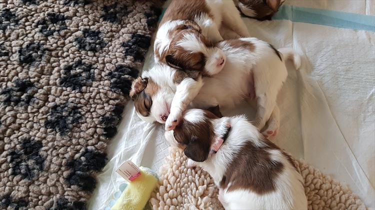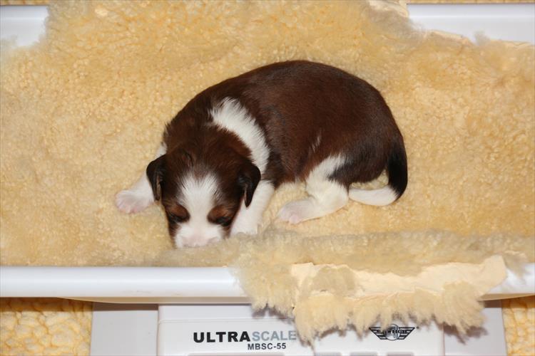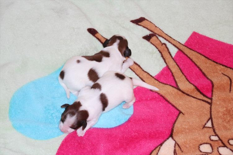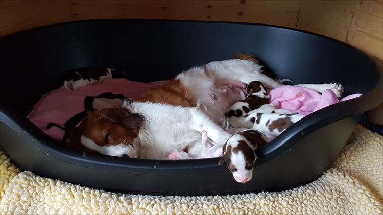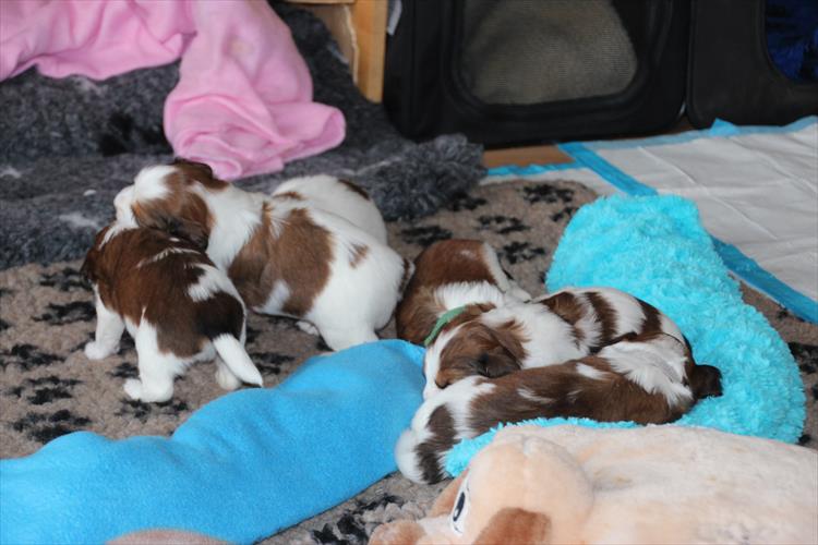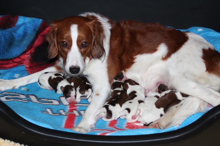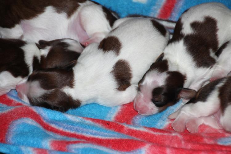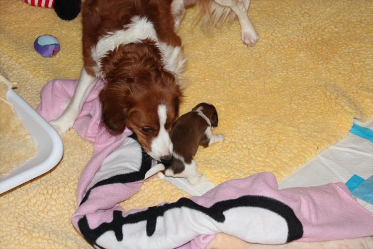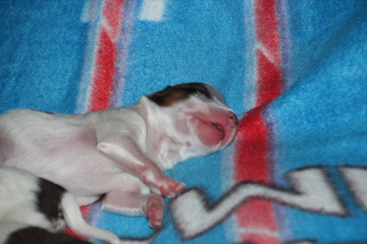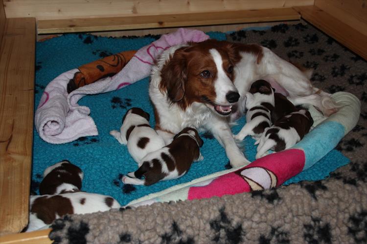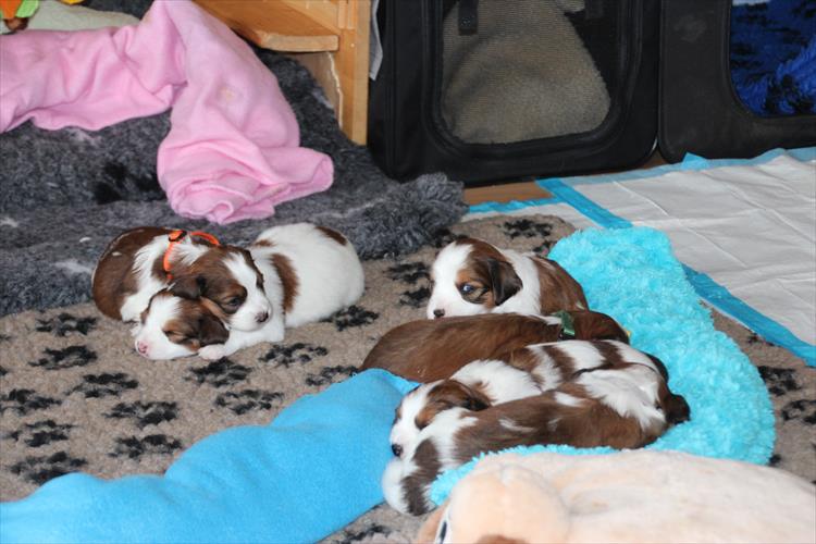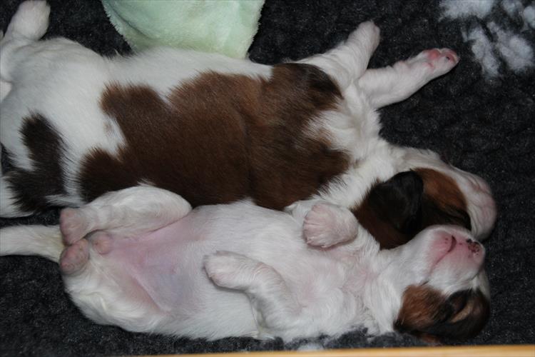 Die Welpen befinden sich in der Neonatalen Phase (die ersten 14 Tage). Sie sind Nesthocker und in den ersten Lebenswochen absolut abhängig von der mütterlichen Fürsorge. Ohne diese können sie nicht überleben. Dreamy verlässt die Welpenbox noch sehr selten und ist um die Welpen sehr bemüht. Die kleinen Welpen sind nach der Geburt noch taub und blind. Augen und Gehörgänge sich noch verschlossen. Die Kleinen sind noch nicht in der Lage ihre eigene Wärme zu regulieren. Sie verfügen über einen Wärmesinn, Tastsinn und einen eingeschränkten Geruchssinn. Durch typische Pendelbewegungen des Kopfes suchen sie die Zitzen. Die Wärmesensoren befinden sich im Kopfbereich. Sie können sehr genau warm und kalt unterscheiden. Wird es den Welpies zu kalt, bewegen sie sich reflexartig, bis sie die Mutter oder andere Geschwister gefunden haben. Sie können noch nicht selbstständig Kot und Urin absetzen. Durch das Lecken der Mutter am Bauch und im Genitalbereich wird die Verdauung angeregt. Die Welpen schlafen jetzt 16 bis 20 Stunden.