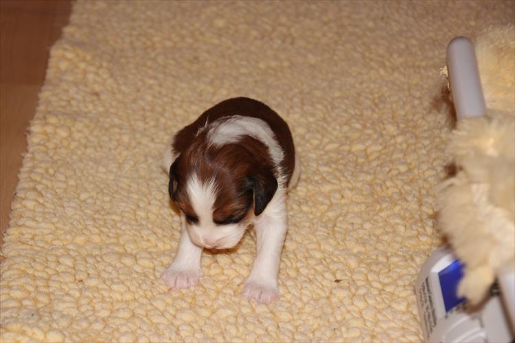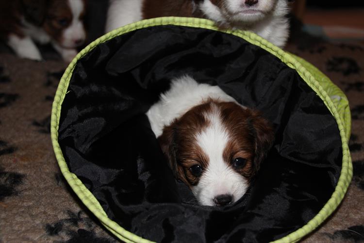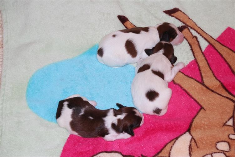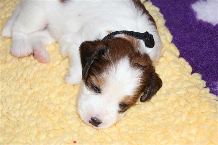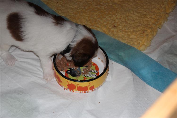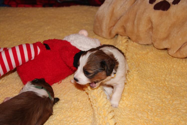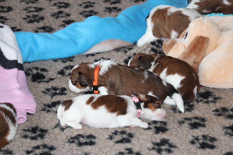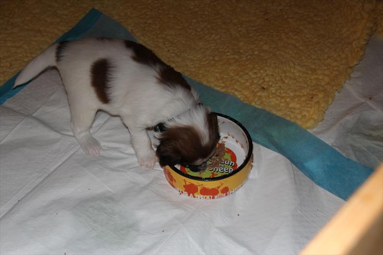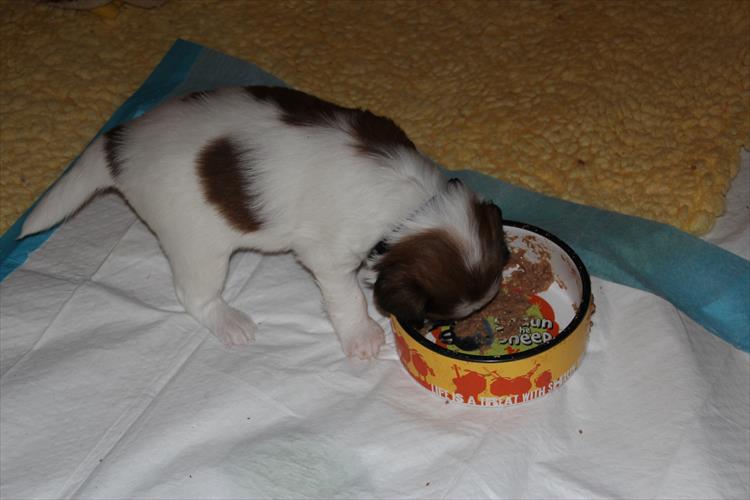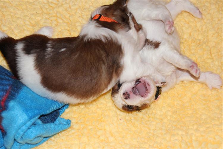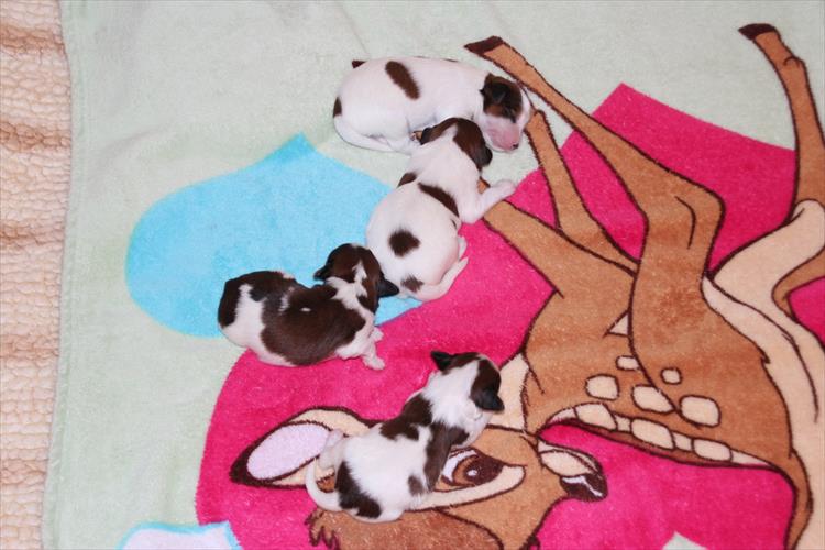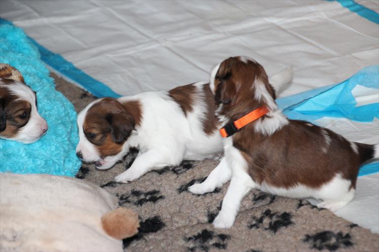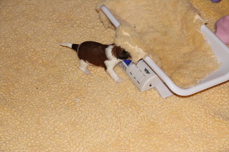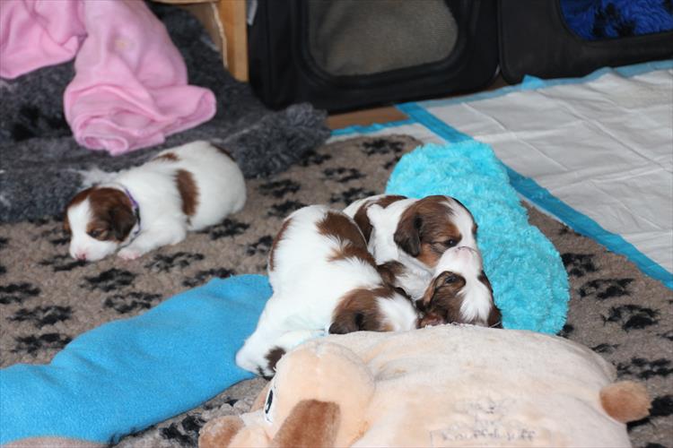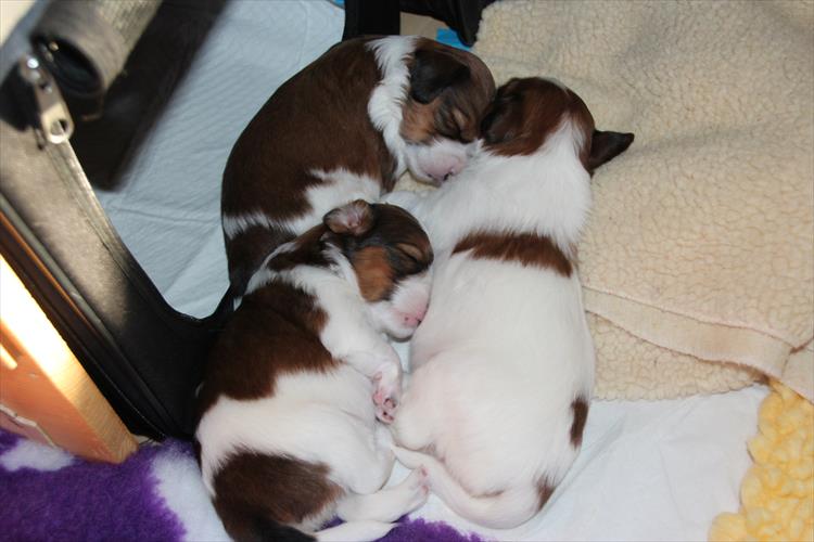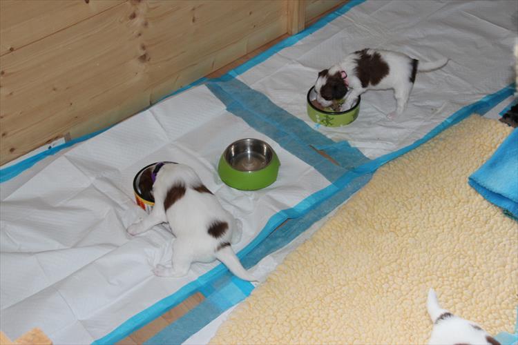 Unsere Zwerge kommen jetzt in die Übergangsphase.(3. Woche). Sie dauert vom Öffnen der Augen 10. bis 14. Lebenstag bis zum vollständigen Öffnen des Gehörganges 13 bis 15. Lebenstag. Das Öffnen der Augen erfolgt vom inneren Augenwinkel. Die Augen sind zunächst trüb. Zuerst werden Bewegungen als Schatten wahrgenommen. Danach verbessert sich das Sehen täglich. Die echte Sehfähigkeit der Augen ist erst um den 17. Lebenstag vorhanden. Das gleiche gilt für das Hören. Die Welpen beginnen jetzt ohne Mutters Hilfe ihre "Geschäfte" zu verrichten. Dabei kann man schon mal umfallen. Die Stimulierung von Harn- und Kotabsatz durch die Mutter geht bis zum 16. Lebenstag. Willkürliche Kontrolle des Harnabsatzes ab dem 21. Lebenstag. Muskelzuckungen während des Schlafes ist bis zum 28. Lebenstag zu beobachten. Die Welpen geben jetzt auch Laute von sich wie ein Quieken, leises Knurren und Bellen. Hauptsächlich sind diese Geräusche im Schlaf zu entdecken. In dieser Phase fällt die Entwicklung einer ersten Form der Stubenreinheit auf. Die Welpen machen regelrecht Terror und versuchen die Wurfkiste zu verlassen. Setzt man sie neben die Kiste, lösen sie sich meist sehr schnell und sind danach in der Kiste wieder ruhig und zufrieden. Es zeigen sich erste soziale Verhaltensweisen wie Schwanzwedeln und Knurren den Geschwistern gegenüber.