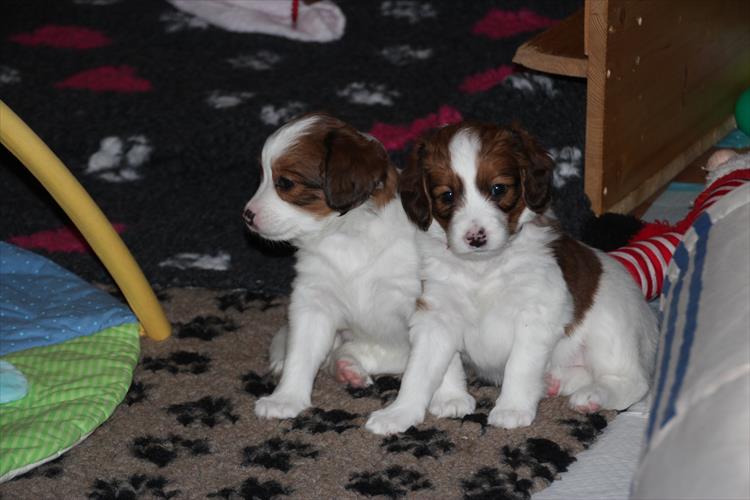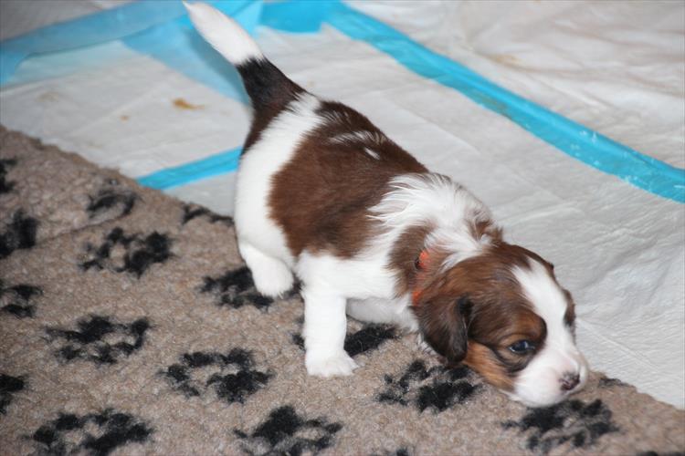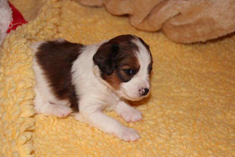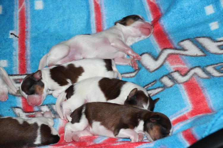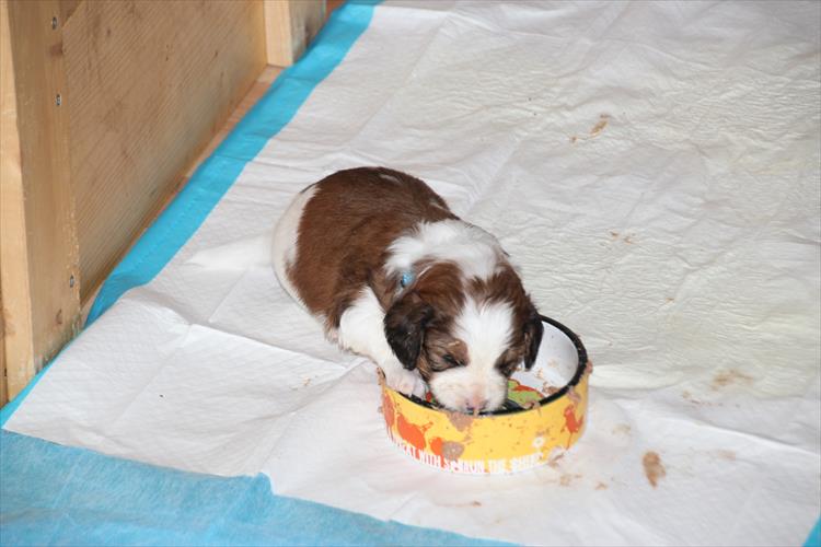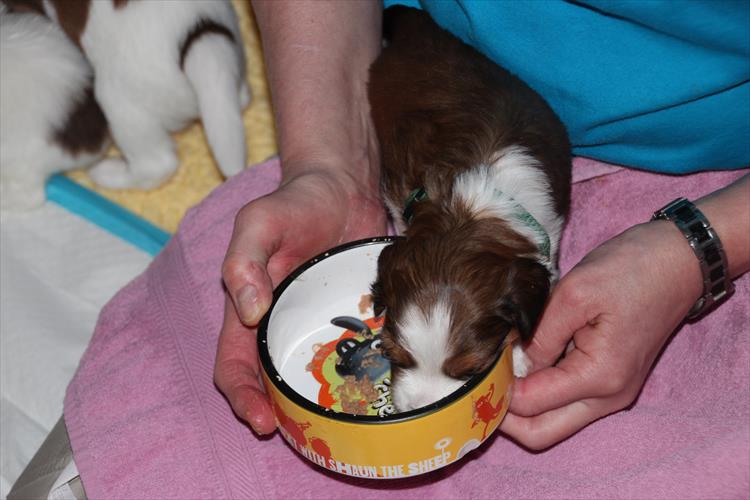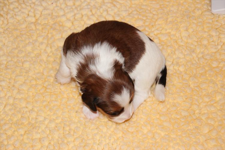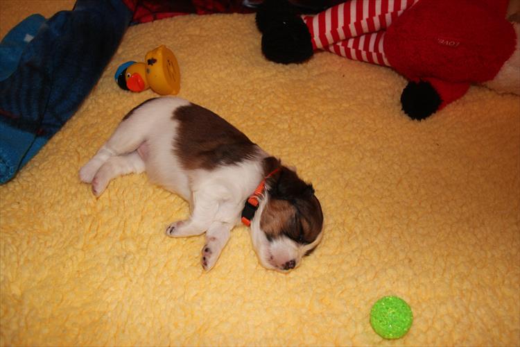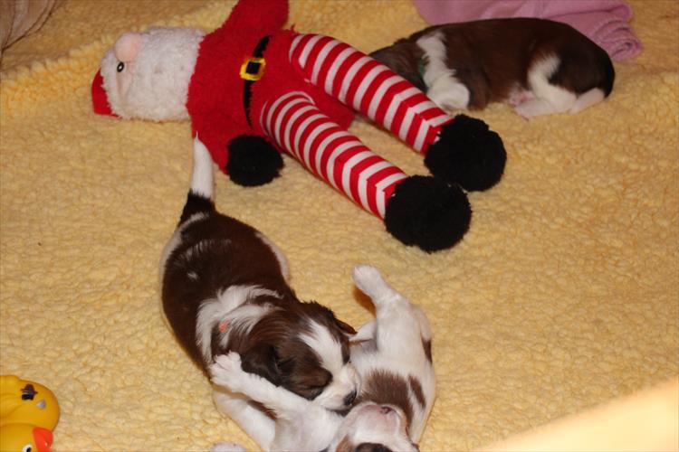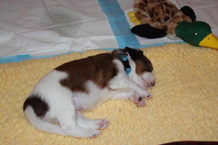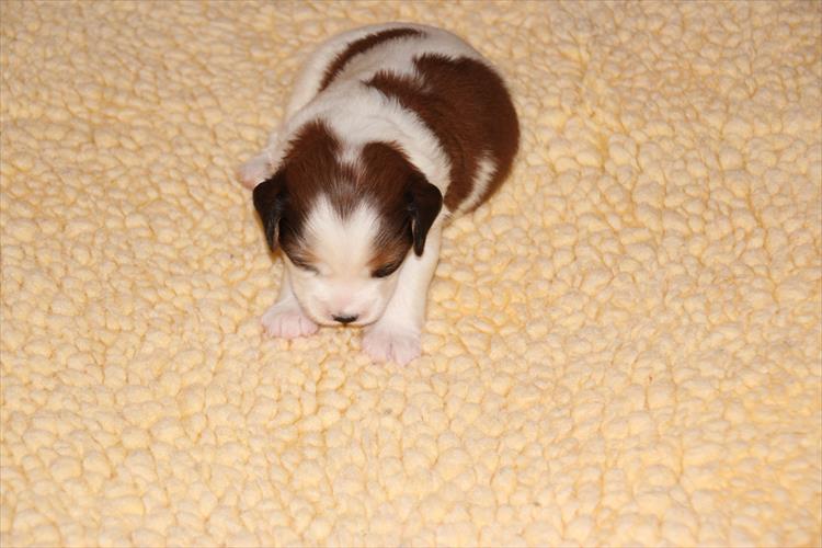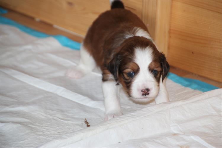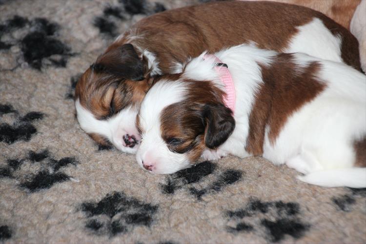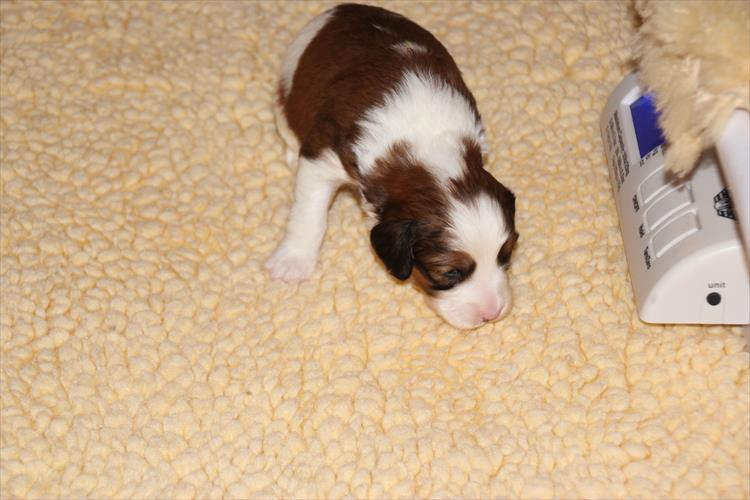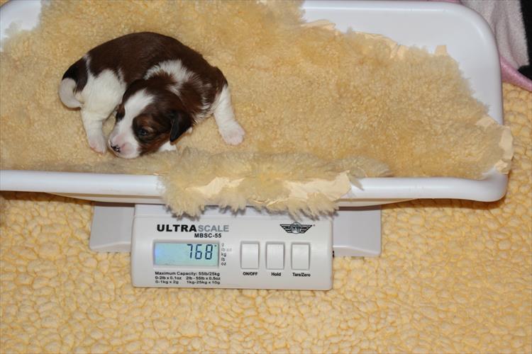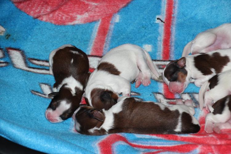 Unsere Zwerge kommen jetzt in die Übergangsphase.(3. Woche). Sie dauert vom Öffnen der Augen 10. bis 14. Lebenstag bis zum vollständigen Öffnen des Gehörganges 13 bis 15. Lebenstag. Das Öffnen der Augen erfolgt vom inneren Augenwinkel. Die Augen sind zunächst trüb. Zuerst werden Bewegungen als Schatten wahrgenommen. Danach verbessert sich das Sehen täglich. Die echte Sehfähigkeit der Augen ist erst um den 17. Lebenstag vorhanden. Das gleiche gilt für das Hören. Die Welpen beginnen jetzt ohne Mutters Hilfe ihre "Geschäfte" zu verrichten. Dabei kann man schon mal umfallen. Die Stimulierung von Harn- und Kotabsatz durch die Mutter geht bis zum 16. Lebenstag. Willkürliche Kontrolle des Harnabsatzes ab dem 21. Lebenstag. Muskelzuckungen während des Schlafes ist bis zum 28. Lebenstag zu beobachten. Die Welpen geben jetzt auch Laute von sich wie ein Quieken, leises Knurren und Bellen. Hauptsächlich sind diese Geräusche im Schlaf zu entdecken. In dieser Phase fällt die Entwicklung einer ersten Form der Stubenreinheit auf. Die Welpen machen regelrecht Terror und versuchen die Wurfkiste zu verlassen. Setzt man sie neben die Kiste, lösen sie sich meist sehr schnell und sind danach in der Kiste wieder ruhig und zufrieden. Es zeigen sich erste soziale Verhaltensweisen wie Schwanzwedeln und Knurren den Geschwistern gegenüber.