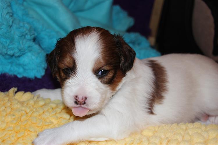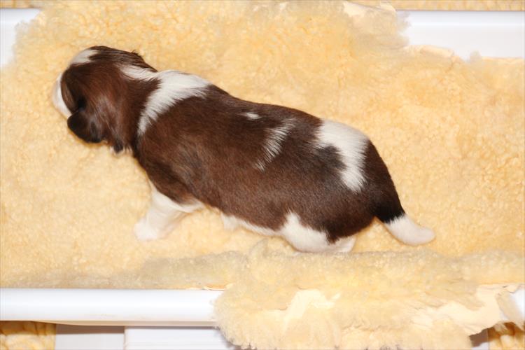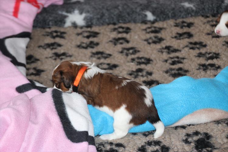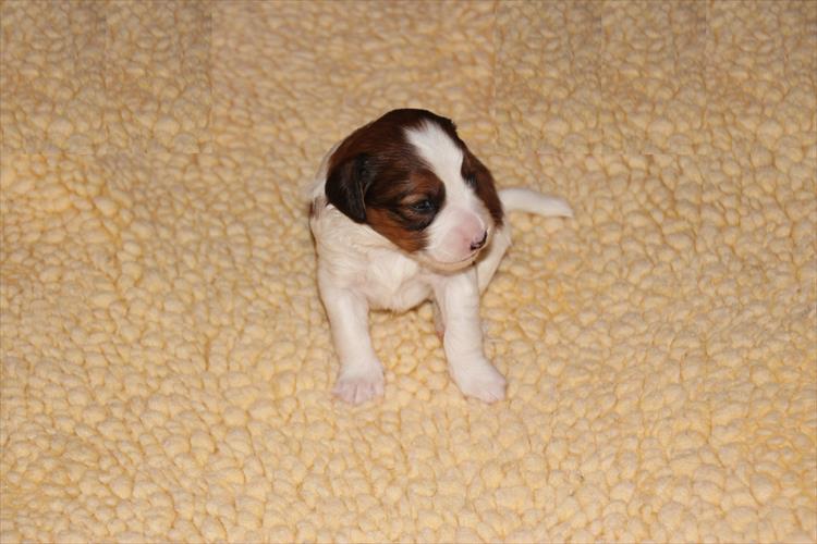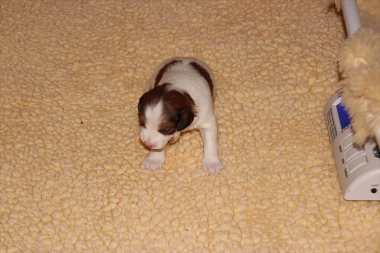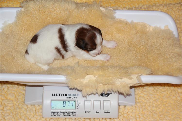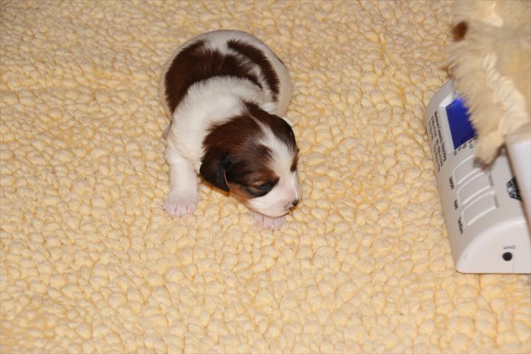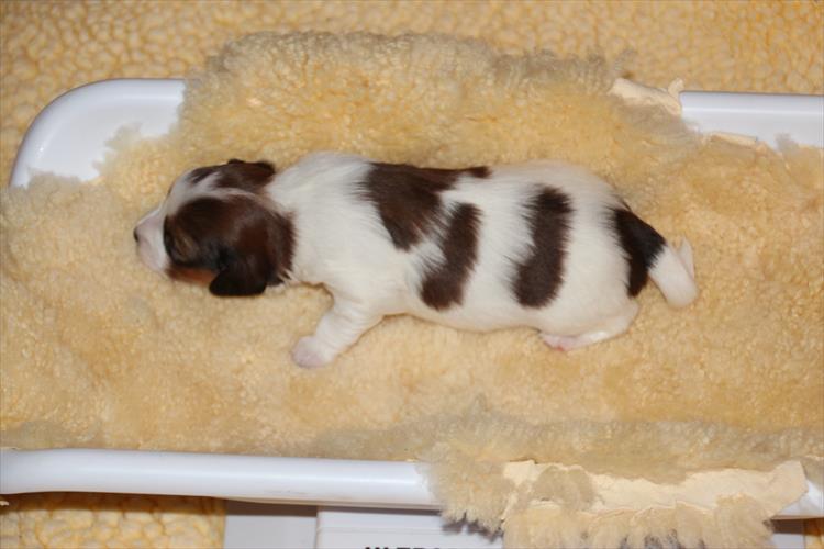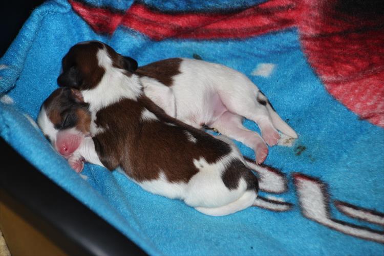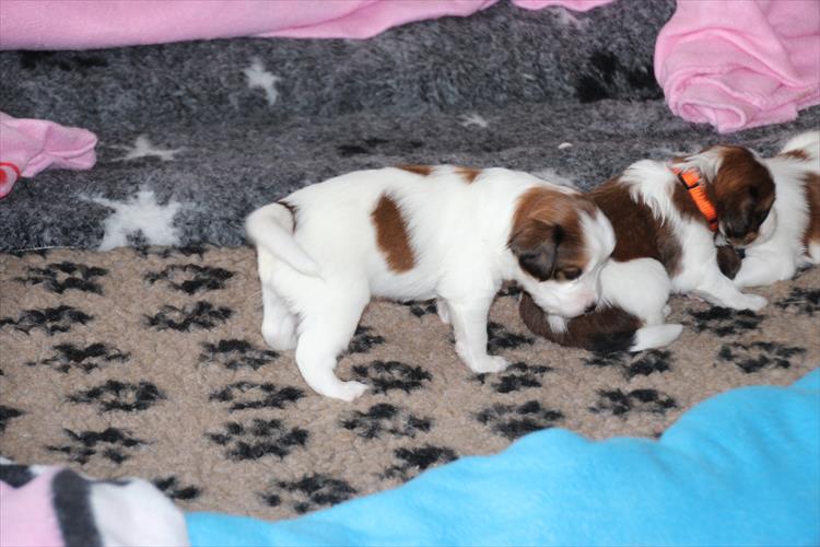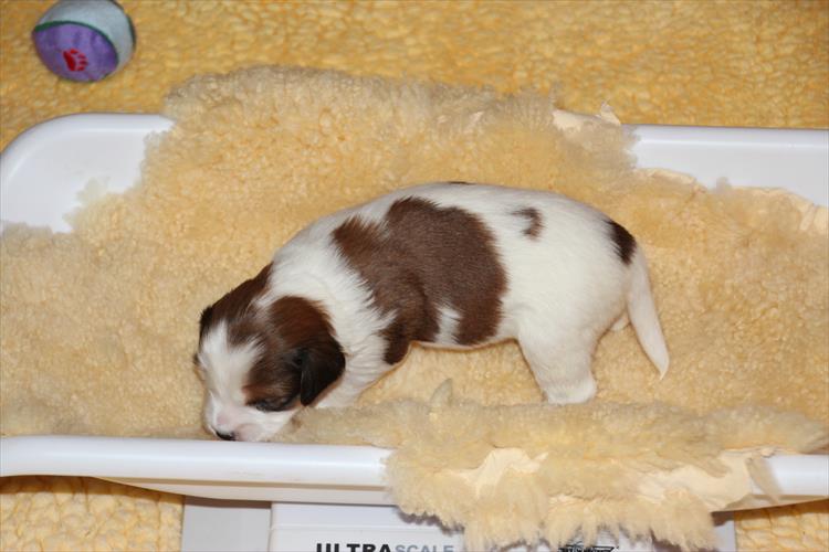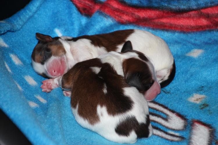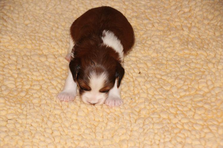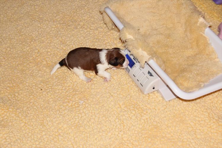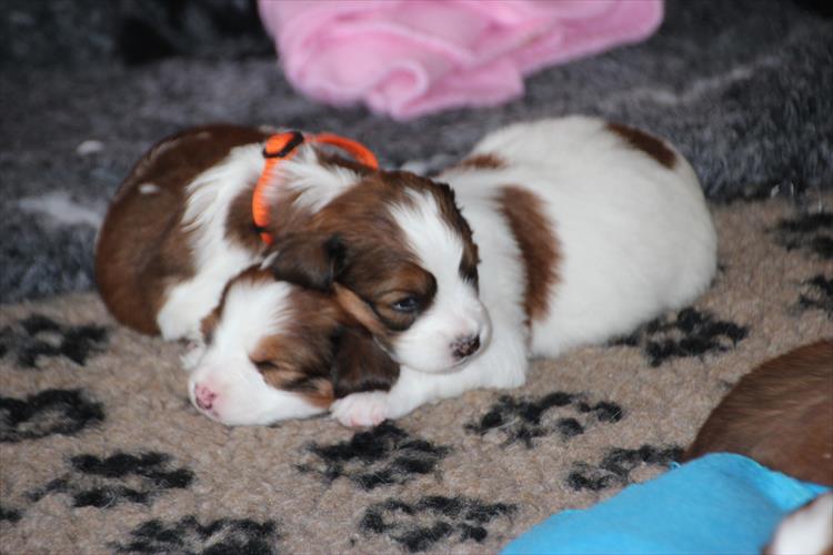 Unsere Zwerge kommen jetzt in die Übergangsphase.(3. Woche). Sie dauert vom Öffnen der Augen 10. bis 14. Lebenstag bis zum vollständigen Öffnen des Gehörganges 13 bis 15. Lebenstag. Das Öffnen der Augen erfolgt vom inneren Augenwinkel. Die Augen sind zunächst trüb. Zuerst werden Bewegungen als Schatten wahrgenommen. Danach verbessert sich das Sehen täglich. Die echte Sehfähigkeit der Augen ist erst um den 17. Lebenstag vorhanden. Das gleiche gilt für das Hören. Die Welpen beginnen jetzt ohne Mutters Hilfe ihre "Geschäfte" zu verrichten. Dabei kann man schon mal umfallen. Die Stimulierung von Harn- und Kotabsatz durch die Mutter geht bis zum 16. Lebenstag. Willkürliche Kontrolle des Harnabsatzes ab dem 21. Lebenstag. Muskelzuckungen während des Schlafes ist bis zum 28. Lebenstag zu beobachten. Die Welpen geben jetzt auch Laute von sich wie ein Quieken, leises Knurren und Bellen. Hauptsächlich sind diese Geräusche im Schlaf zu entdecken. In dieser Phase fällt die Entwicklung einer ersten Form der Stubenreinheit auf. Die Welpen machen regelrecht Terror und versuchen die Wurfkiste zu verlassen. Setzt man sie neben die Kiste, lösen sie sich meist sehr schnell und sind danach in der Kiste wieder ruhig und zufrieden. Es zeigen sich erste soziale Verhaltensweisen wie Schwanzwedeln und Knurren den Geschwistern gegenüber.