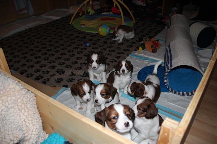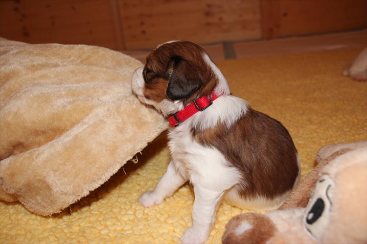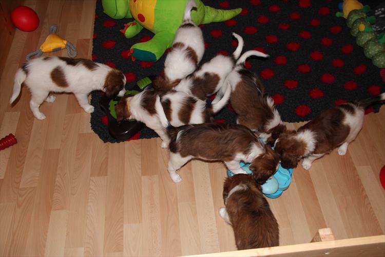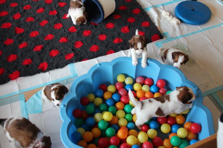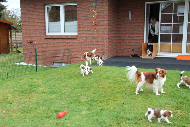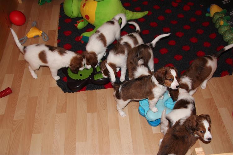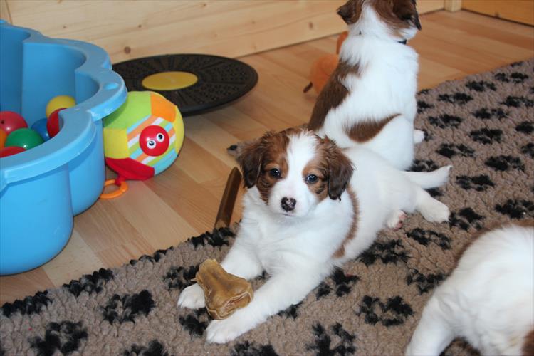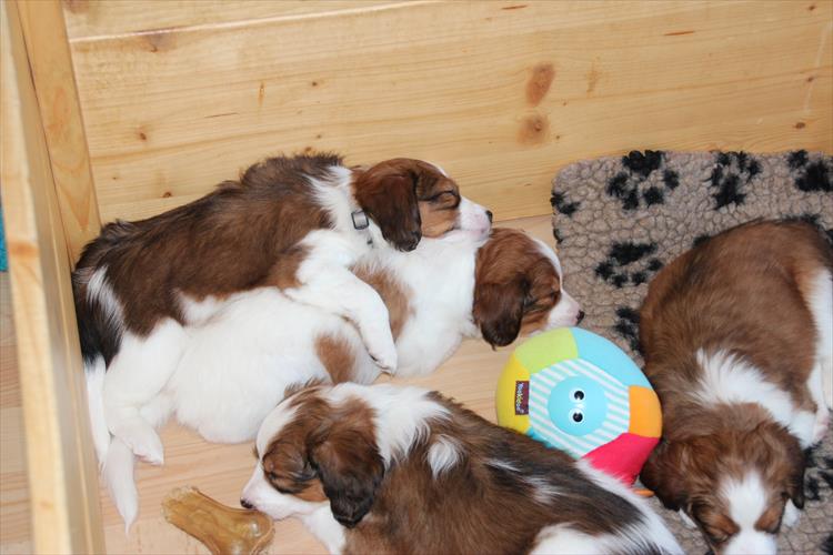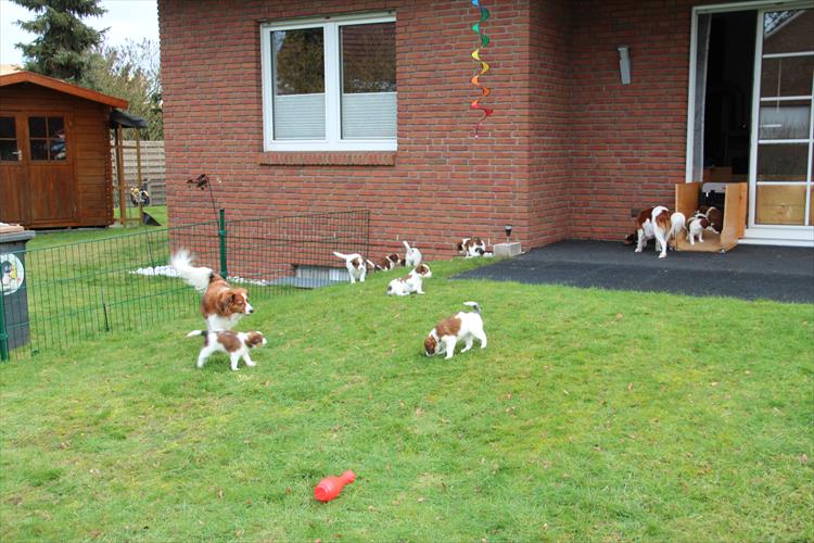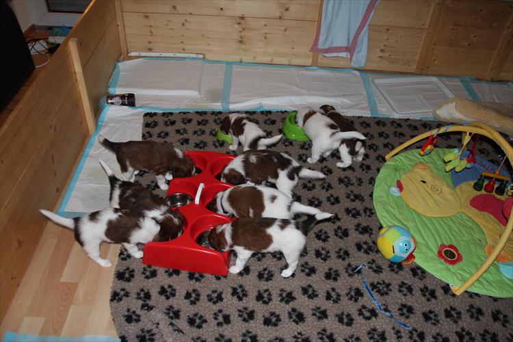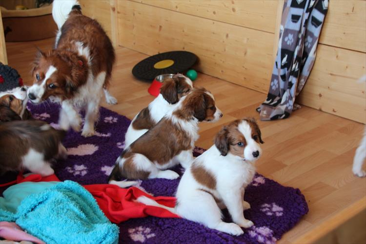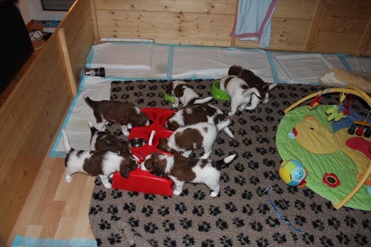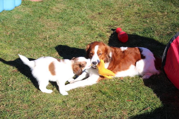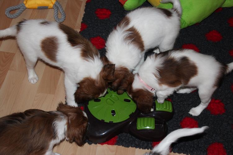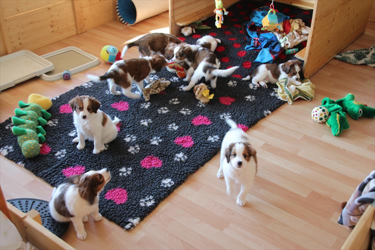 Unsere Zwerge sind jetzt in der Sozialisationsphase (4. bis 16. Lebenswoche). In dieser Phase werden die Welpen intensiv auf seine Geschwister und vor allem auf den Menschen geprägt (Prägungsphase). Sie lernen auf spielerische Weise den Umgang mit ihren Geschwistern. Sie springen, knurren, fordern zum Spiel auf, unterwerfen sich, quietschen und schreien. Sie entdecken, erkunden, untersuchen, laufen, rempeln und rangeln in den immer länger werdenden Wachphasen. Im Spiel lernen sie Stärken und Schwächen des Spielpartners kennen. Die Sinnesleistungen und der Bewegungsapparat funktionieren schon recht gut. Die Kleinen gehen zeitweise recht rabiat miteinander um. Wenn mal einer zu weit gegangen ist, folgen prompt lautstarkes Geschrei und Protest. Daraus lernen die Welpen wie weit sie gehen können, bevor es weh tut. Das führt zu ersten sozialen Lerneffekten und begründet die Entstehung und Ausbildung einer Beißhemmung. Beißhemmung muss gelernt werden und das geschieht sehr früh innerhalb der Geschwisterschar und im Umgang mit der Mutter. Welpen wissen, wie man zubeißt, aber nicht wie heftig und wann man wieder los lässt. Die Lernmethode ist relativ einfach: Bist du zu rabiat, dann geh ich weg von dir und du bist allein!