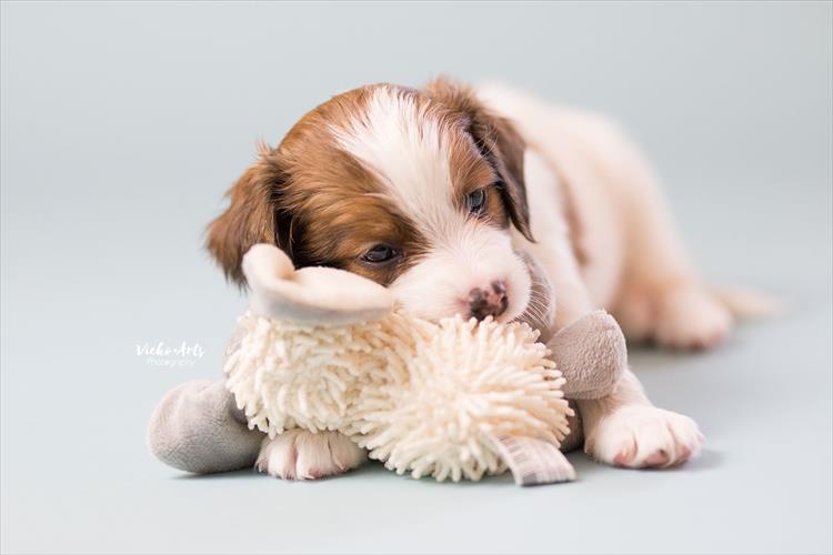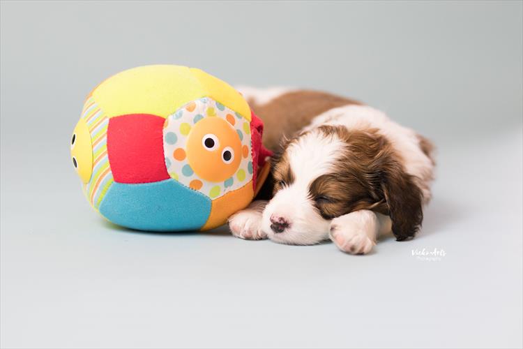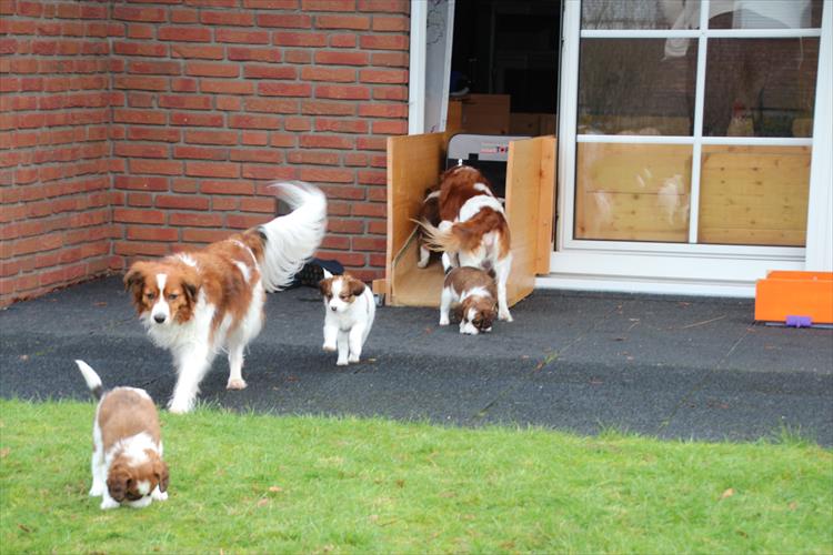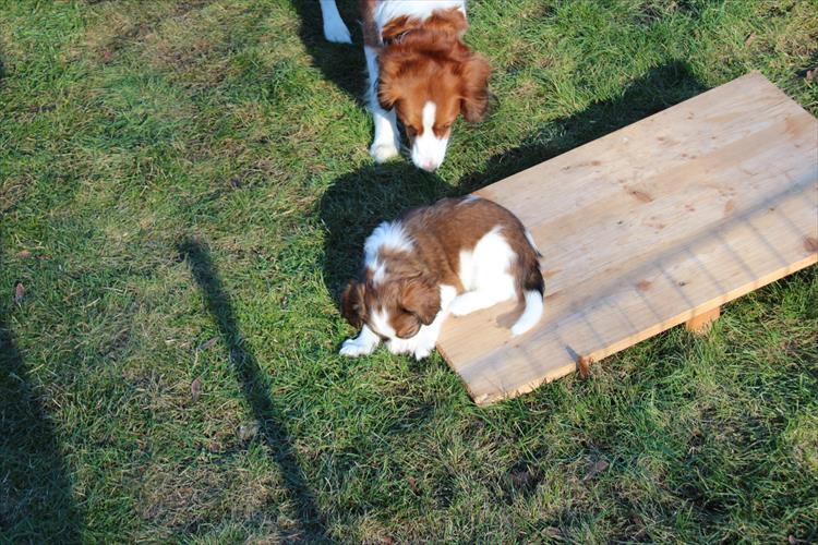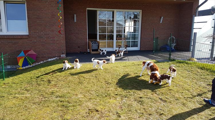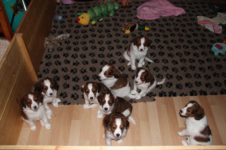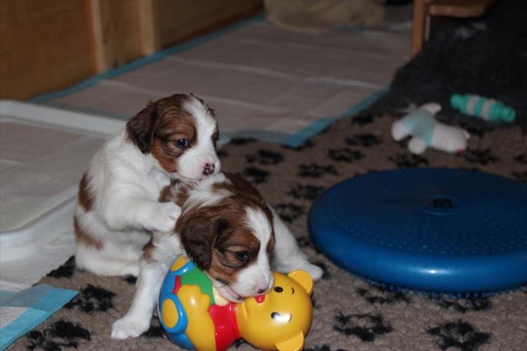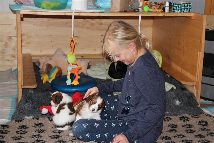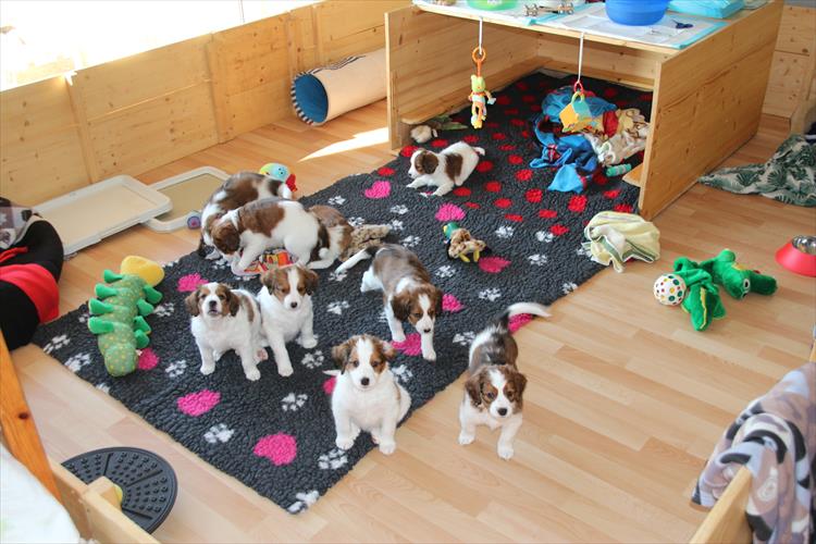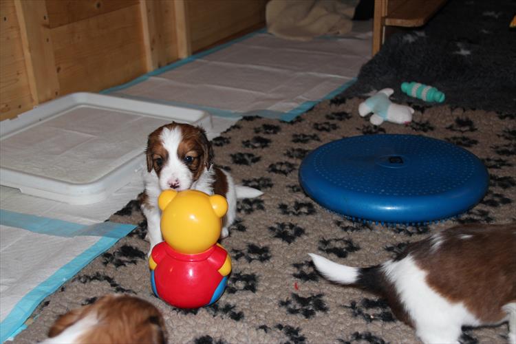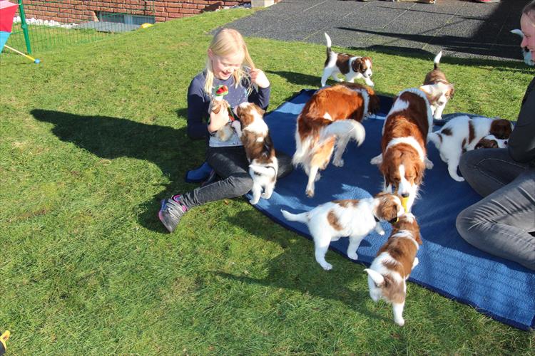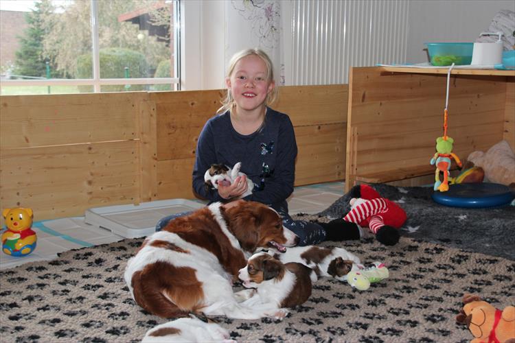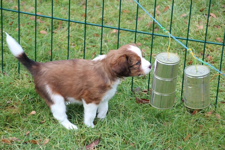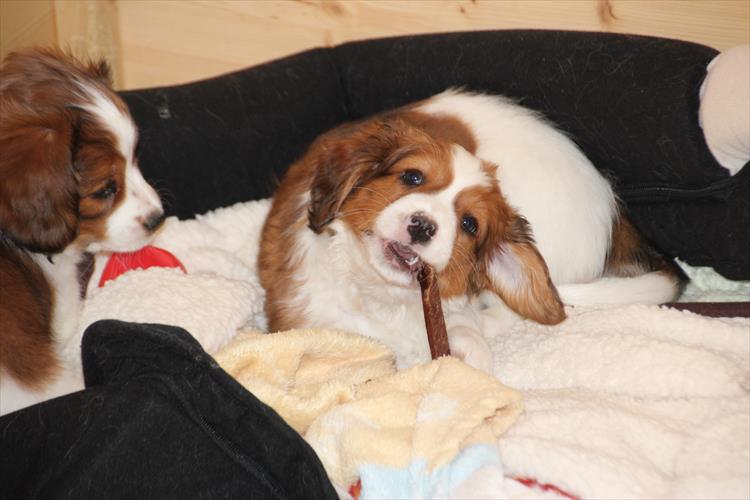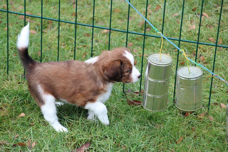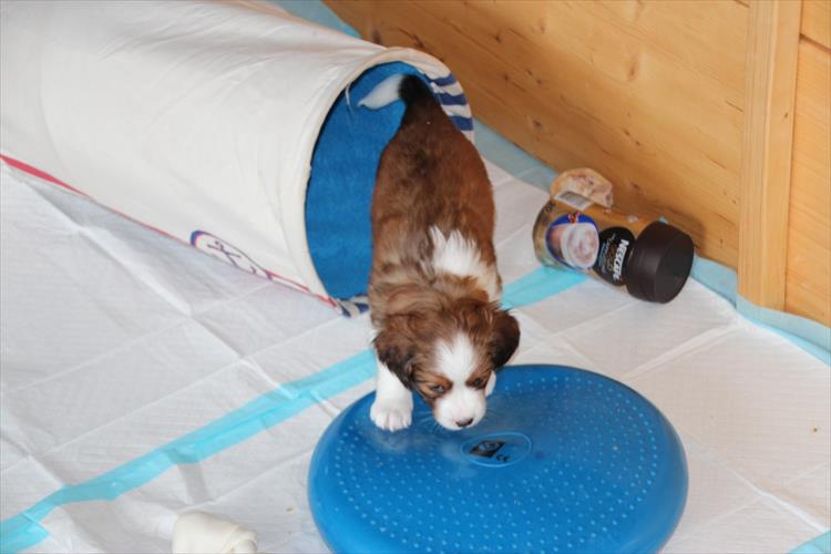Unsere Zwerge sind jetzt in der Sozialisationsphase (4. bis 16. Lebenswoche). In dieser Phase werden die Welpen intensiv auf seine Geschwister und vor allem auf den Menschen geprägt (Prägungsphase). Sie lernen auf spielerische Weise den Umgang mit ihren Geschwistern. Sie springen, knurren, fordern zum Spiel auf, unterwerfen sich, quietschen und schreien. Sie entdecken, erkunden, untersuchen, laufen, rempeln und rangeln in den immer länger werdenden Wachphasen. Im Spiel lernen sie Stärken und Schwächen des Spielpartners kennen. Die Sinnesleistungen und der Bewegungsapparat funktionieren schon recht gut. Die Kleinen gehen zeitweise recht rabiat miteinander um. Wenn mal einer zu weit gegangen ist, folgen prompt lautstarkes Geschrei und Protest. Daraus lernen die Welpen wie weit sie gehen können, bevor es weh tut. Das führt zu ersten sozialen Lerneffekten und begründet die Entstehung und Ausbildung einer Beißhemmung. Beißhemmung muss gelernt werden und das geschieht sehr früh innerhalb der Geschwisterschar und im Umgang mit der Mutter. Welpen wissen, wie man zubeißt, aber nicht wie heftig und wann man wieder los lässt. Die Lernmethode ist relativ einfach: Bist du zu rabiat, dann geh ich weg von dir und du bist allein!