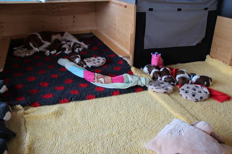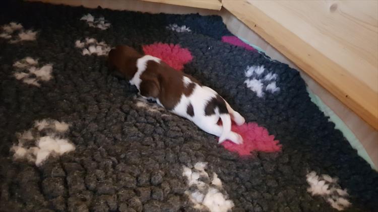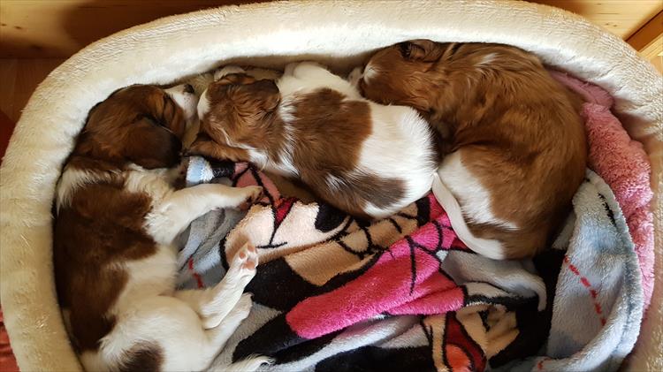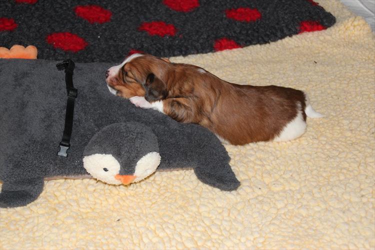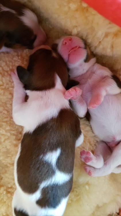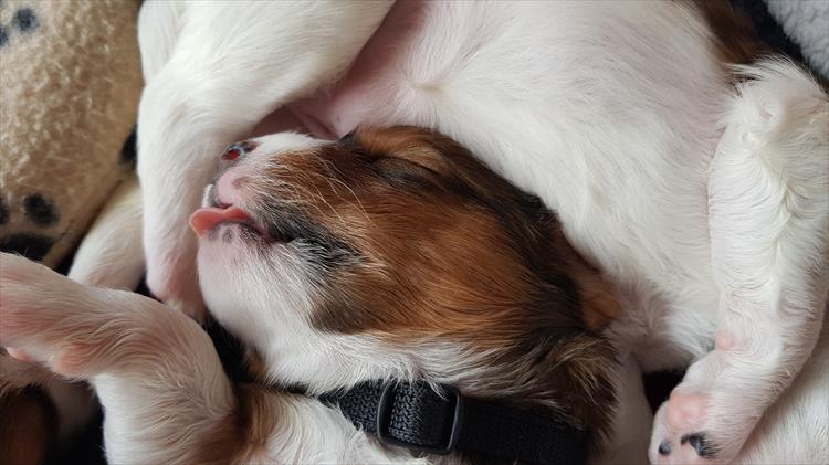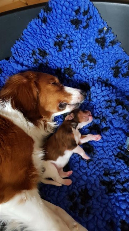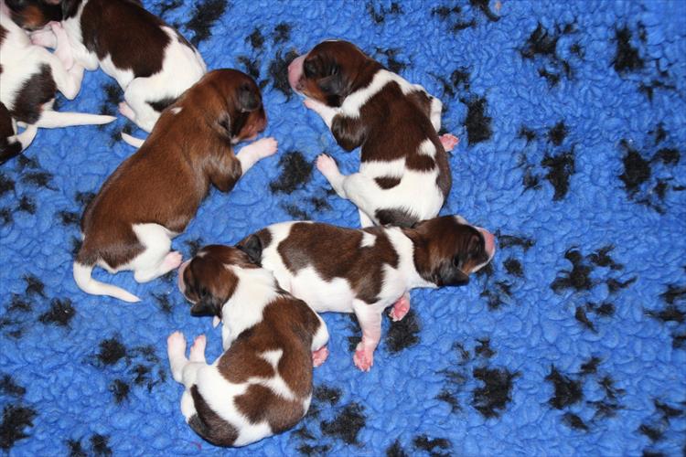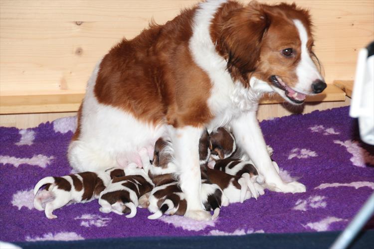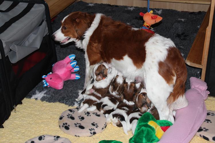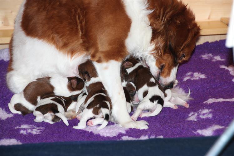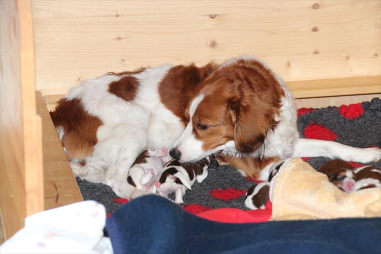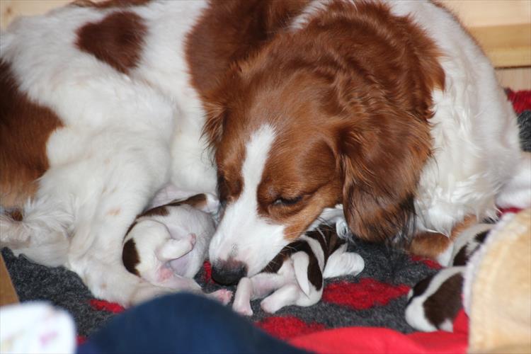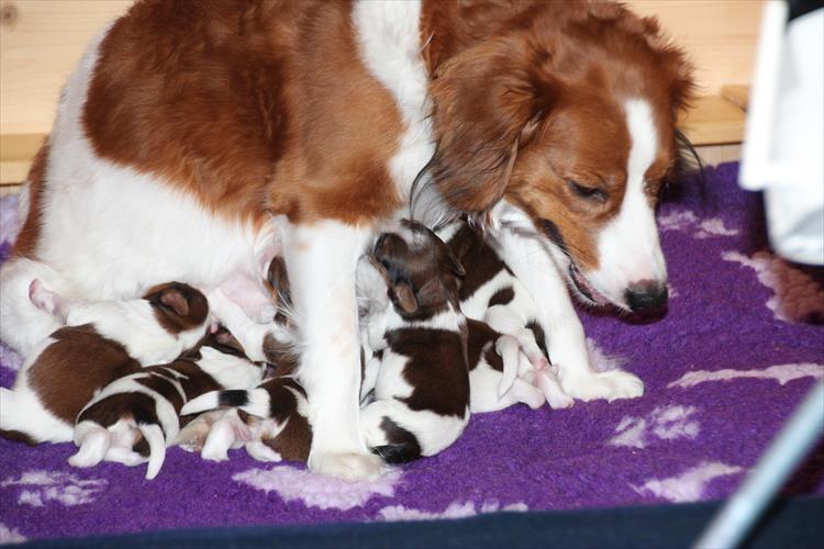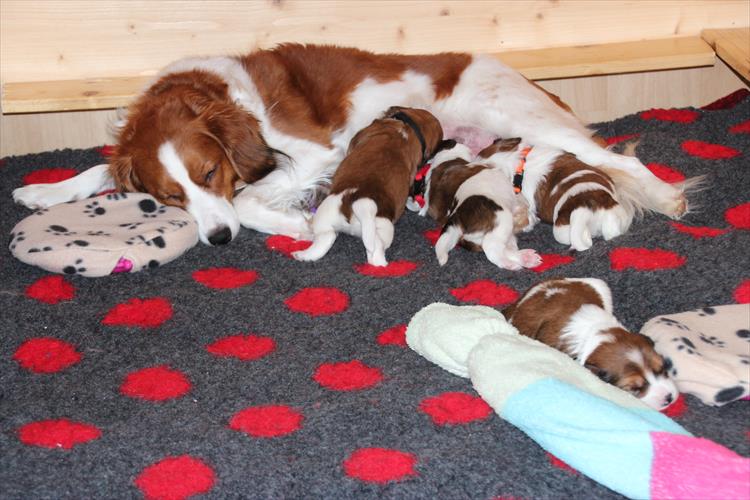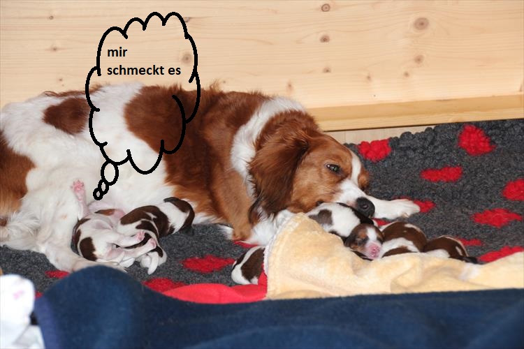 Die Welpen befinden sich in der Neonatalen Phase (die ersten 14 Tage). Sie sind Nesthocker und in den ersten Lebenswochen absolut abhängig von der mütterlichen Fürsorge. Ohne diese können sie nicht überleben. Dreamy verlässt die Welpenbox noch sehr selten und ist um die Welpen sehr bemüht. Die kleinen Welpen sind nach der Geburt noch taub und blind. Augen und Gehörgänge sich noch verschlossen. Die Kleinen sind noch nicht in der Lage ihre eigene Wärme zu regulieren. Sie verfügen über einen Wärmesinn, Tastsinn und einen eingeschränkten Geruchssinn. Durch typische Pendelbewegungen des Kopfes suchen sie die Zitzen. Die Wärmesensoren befinden sich im Kopfbereich. Sie können sehr genau warm und kalt unterscheiden. Wird es den Welpies zu kalt, bewegen sie sich reflexartig, bis sie die Mutter oder andere Geschwister gefunden haben. Sie können noch nicht selbstständig Kot und Urin absetzen. Durch das Lecken der Mutter am Bauch und im Genitalbereich wird die Verdauung angeregt. Die Welpen schlafen jetzt 16 bis 20 Stunden.