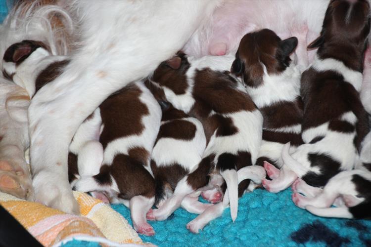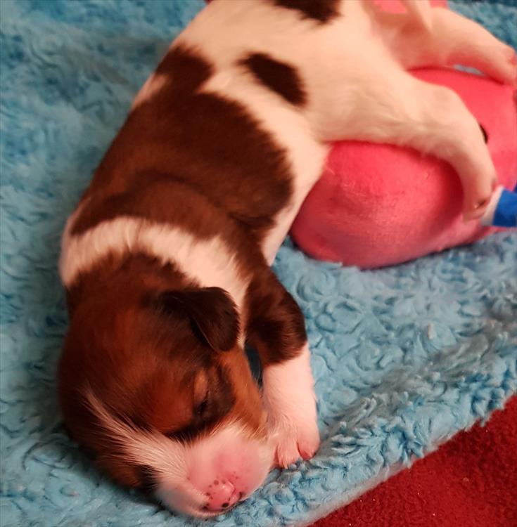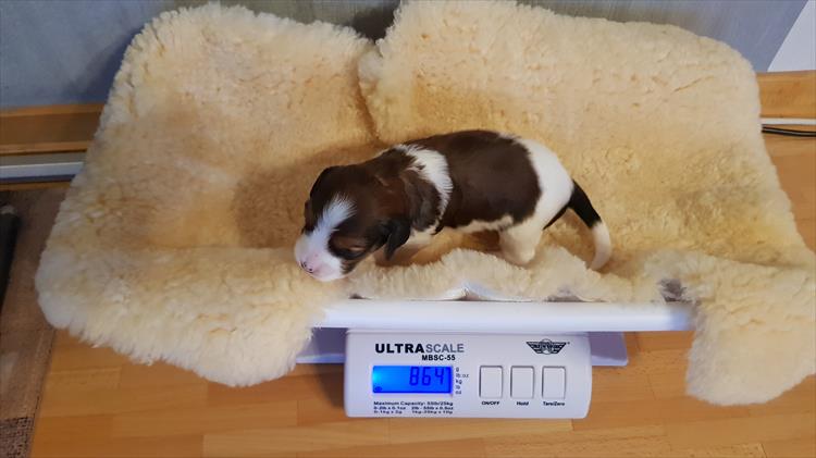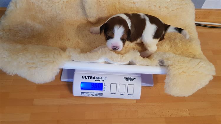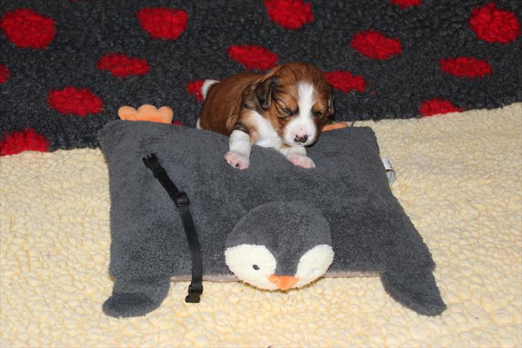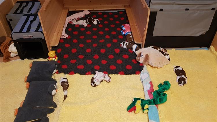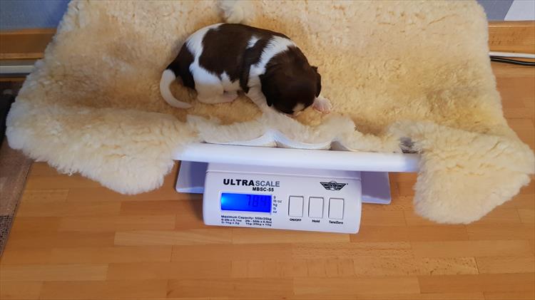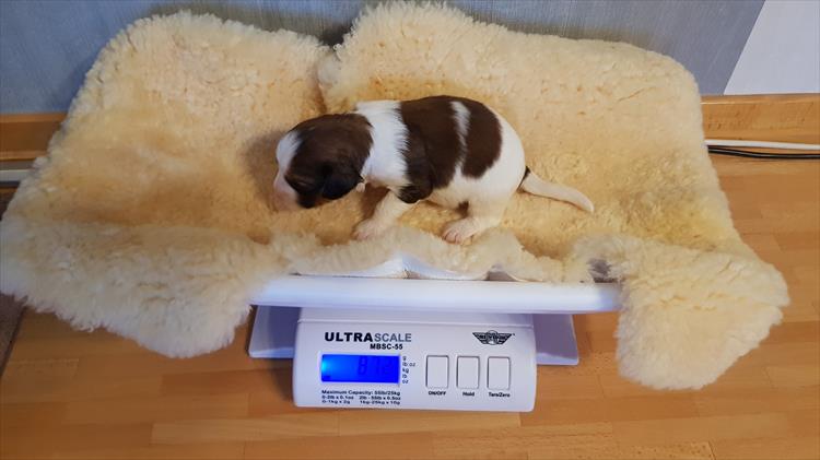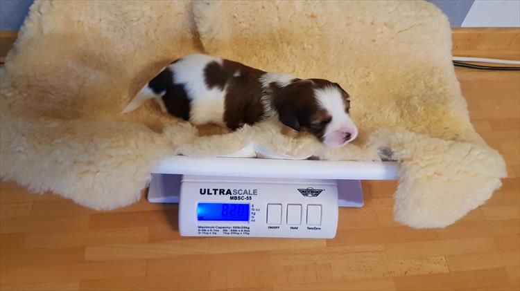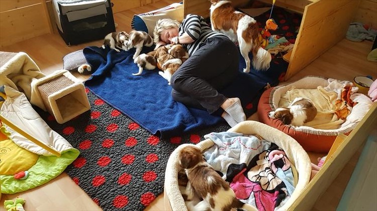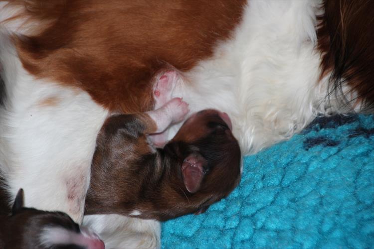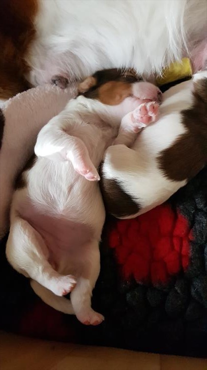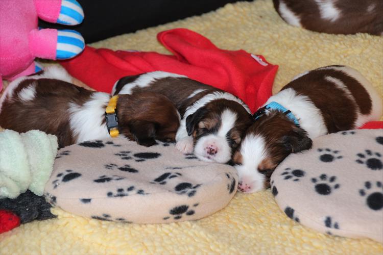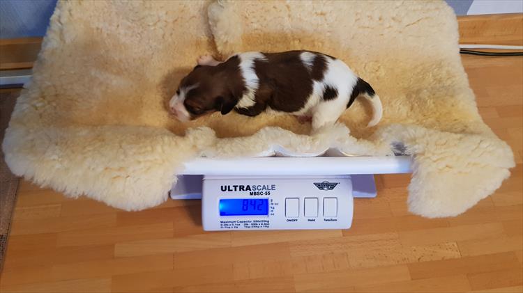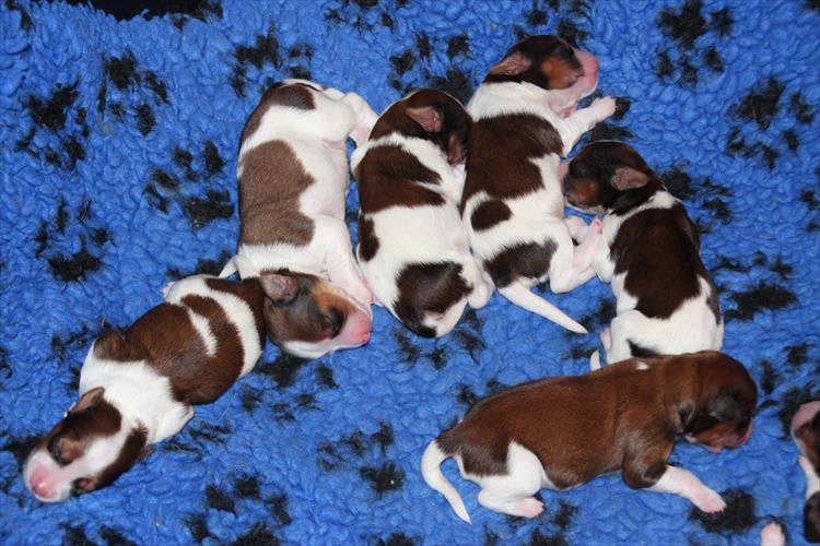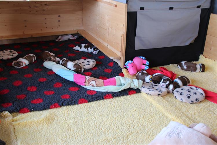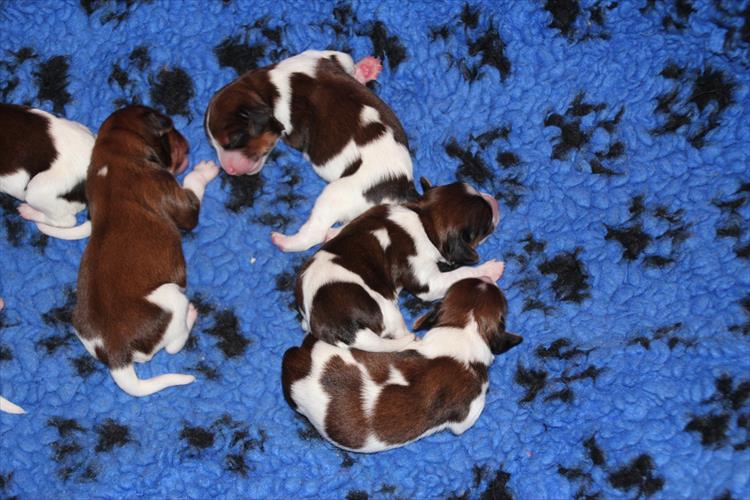Die Welpen befinden sich in der Neonatalen Phase (die ersten 14 Tage). Sie sind Nesthocker und in den ersten Lebenswochen absolut abhängig von der mütterlichen Fürsorge. Ohne diese können sie nicht überleben. Dreamy verlässt die Welpenbox noch sehr selten und ist um die Welpen sehr bemüht. Die kleinen Welpen sind nach der Geburt noch taub und blind. Augen und Gehörgänge sich noch verschlossen. Die Kleinen sind noch nicht in der Lage ihre eigene Wärme zu regulieren. Sie verfügen über einen Wärmesinn, Tastsinn und einen eingeschränkten Geruchssinn. Durch typische Pendelbewegungen des Kopfes suchen sie die Zitzen. Die Wärmesensoren befinden sich im Kopfbereich. Sie können sehr genau warm und kalt unterscheiden. Wird es den Welpies zu kalt, bewegen sie sich reflexartig, bis sie die Mutter oder andere Geschwister gefunden haben. Sie können noch nicht selbstständig Kot und Urin absetzen. Durch das Lecken der Mutter am Bauch und im Genitalbereich wird die Verdauung angeregt. Die Welpen schlafen jetzt 16 bis 20 Stunden.
