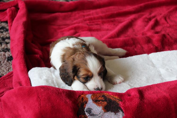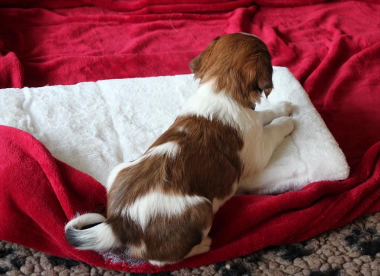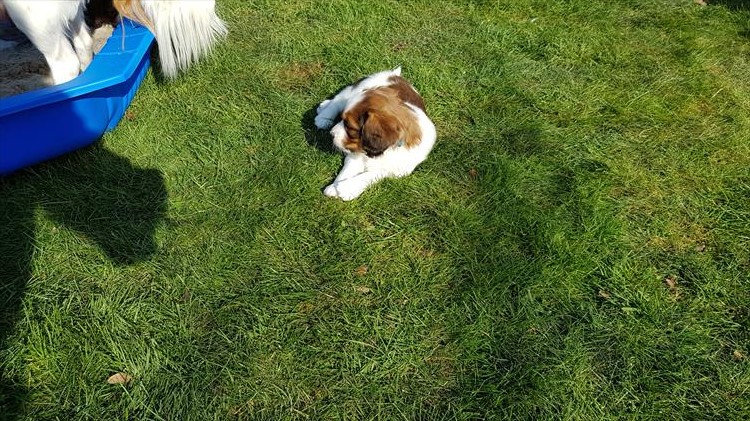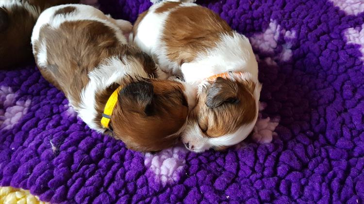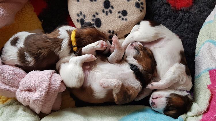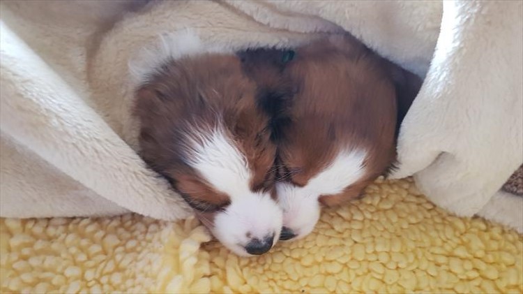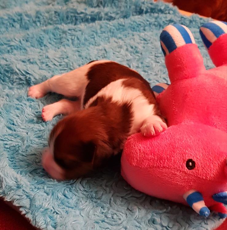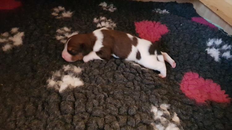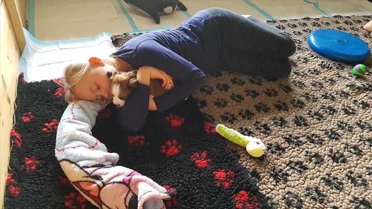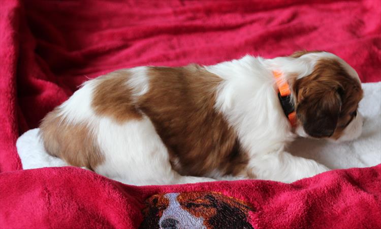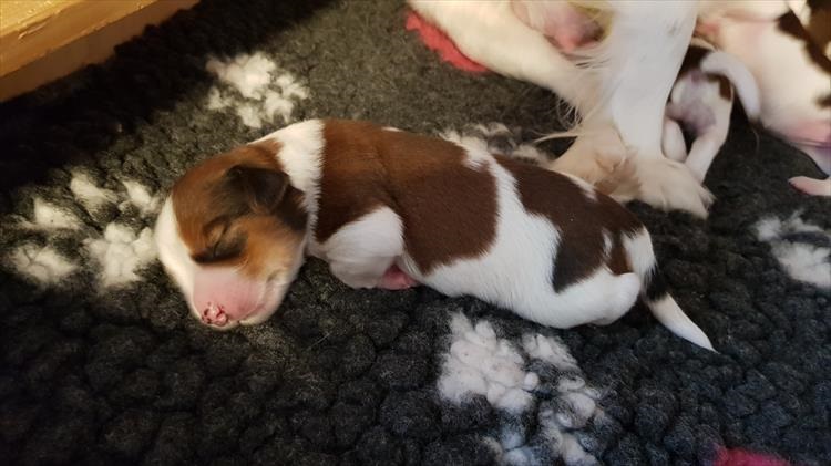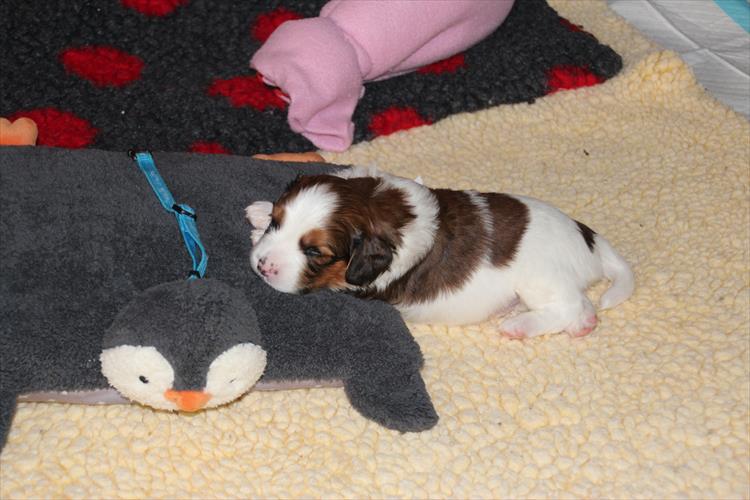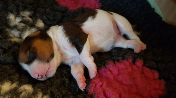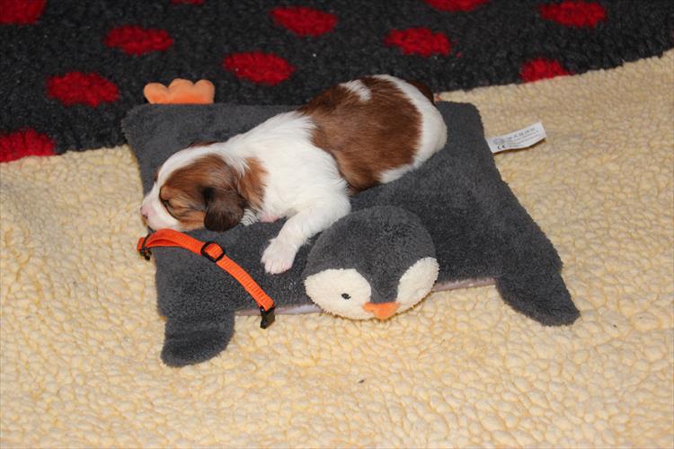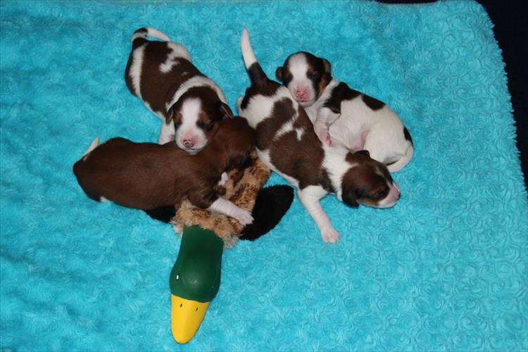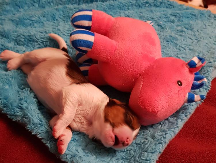 Die Welpen befinden sich in der Neonatalen Phase (die ersten 14 Tage). Sie sind Nesthocker und in den ersten Lebenswochen absolut abhängig von der mütterlichen Fürsorge. Ohne diese können sie nicht überleben. Dreamy verlässt die Welpenbox noch sehr selten und ist um die Welpen sehr bemüht. Die kleinen Welpen sind nach der Geburt noch taub und blind. Augen und Gehörgänge sich noch verschlossen. Die Kleinen sind noch nicht in der Lage ihre eigene Wärme zu regulieren. Sie verfügen über einen Wärmesinn, Tastsinn und einen eingeschränkten Geruchssinn. Durch typische Pendelbewegungen des Kopfes suchen sie die Zitzen. Die Wärmesensoren befinden sich im Kopfbereich. Sie können sehr genau warm und kalt unterscheiden. Wird es den Welpies zu kalt, bewegen sie sich reflexartig, bis sie die Mutter oder andere Geschwister gefunden haben. Sie können noch nicht selbstständig Kot und Urin absetzen. Durch das Lecken der Mutter am Bauch und im Genitalbereich wird die Verdauung angeregt. Die Welpen schlafen jetzt 16 bis 20 Stunden.