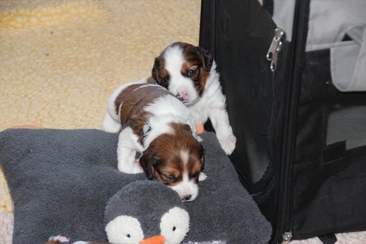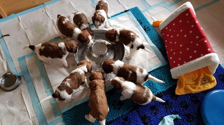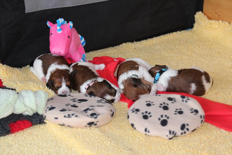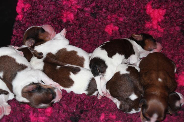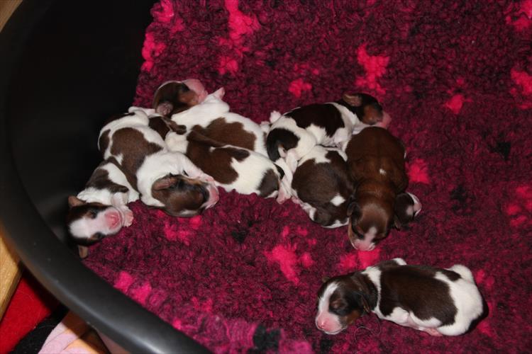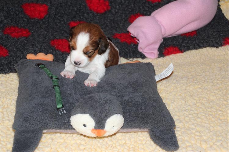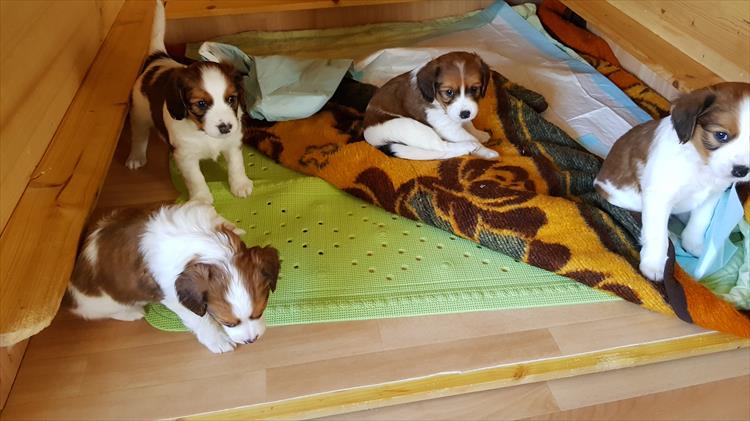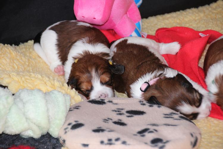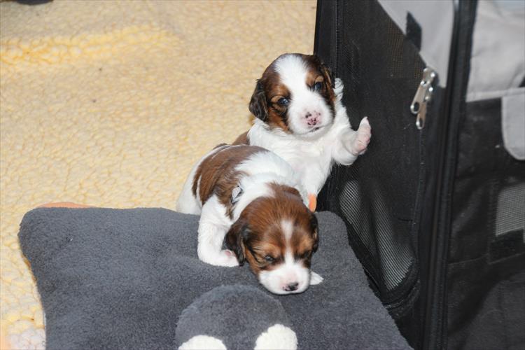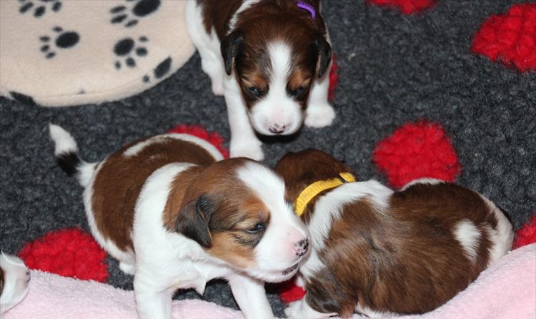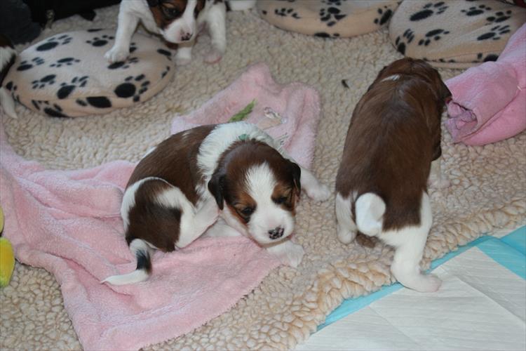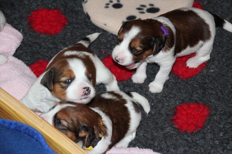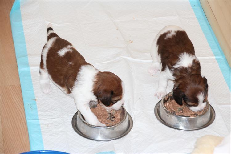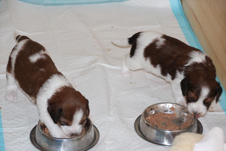 Unsere Zwerge kommen jetzt in die Übergangsphase.(3. Woche). Sie dauert vom Öffnen der Augen 10. bis 14. Lebenstag bis zum vollständigen Öffnen des Gehörganges 13 bis 15. Lebenstag. Das Öffnen der Augen erfolgt vom inneren Augenwinkel. Die Augen sind zunächst trüb. Zuerst werden Bewegungen als Schatten wahrgenommen. Danach verbessert sich das Sehen täglich. Die echte Sehfähigkeit der Augen ist erst um den 17. Lebenstag vorhanden. Das gleiche gilt für das Hören. Die Welpen beginnen jetzt ohne Mutters Hilfe ihre "Geschäfte" zu verrichten. Dabei kann man schon mal umfallen. Die Stimulierung von Harn- und Kotabsatz durch die Mutter geht bis zum 16. Lebenstag. Willkürliche Kontrolle des Harnabsatzes ab dem 21. Lebenstag. Muskelzuckungen während des Schlafes ist bis zum 28. Lebenstag zu beobachten. Die Welpen geben jetzt auch Laute von sich wie ein Quieken, leises Knurren und Bellen. Hauptsächlich sind diese Geräusche im Schlaf zu entdecken. In dieser Phase fällt die Entwicklung einer ersten Form der Stubenreinheit auf. Die Welpen machen regelrecht Terror und versuchen die Wurfkiste zu verlassen. Setzt man sie neben die Kiste, lösen sie sich meist sehr schnell und sind danach in der Kiste wieder ruhig und zufrieden. Es zeigen sich erste soziale Verhaltensweisen wie Schwanzwedeln und Knurren den Geschwistern gegenüber.