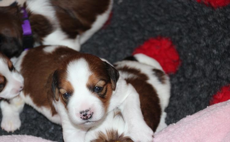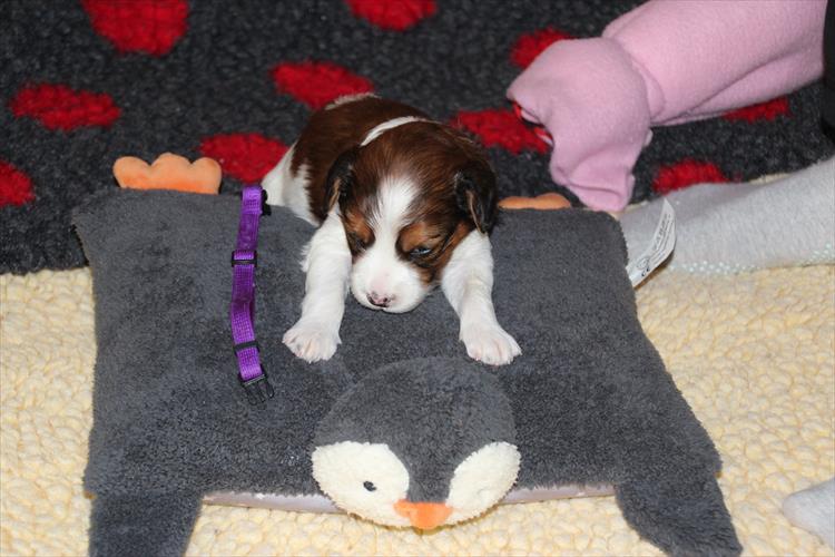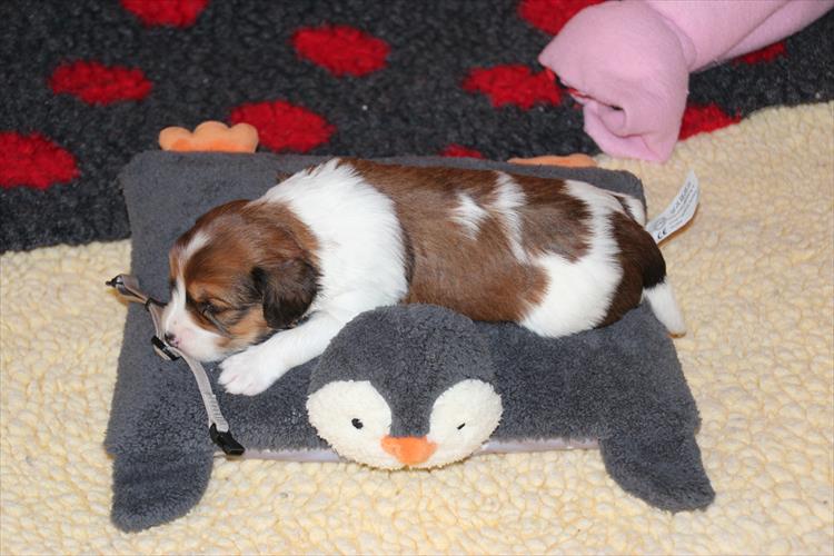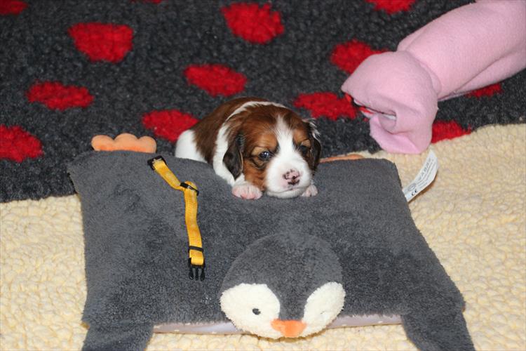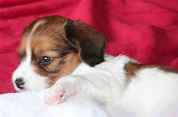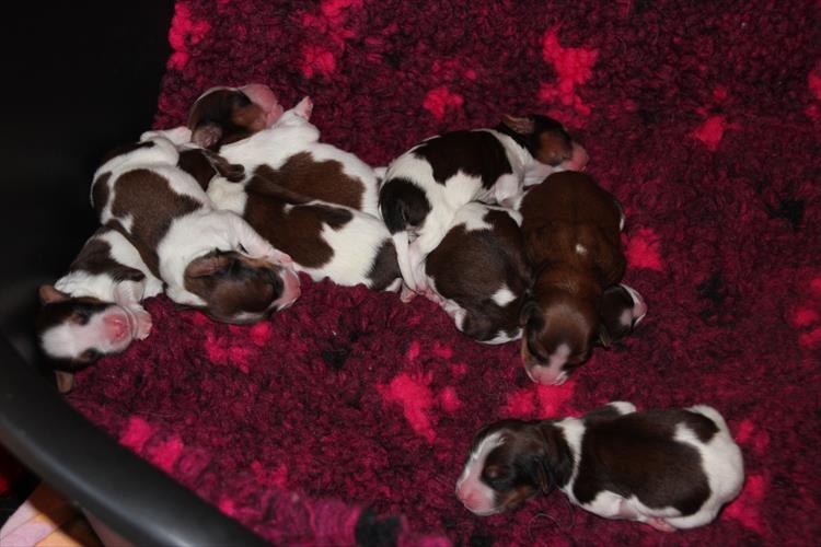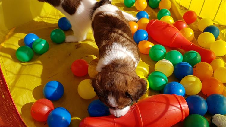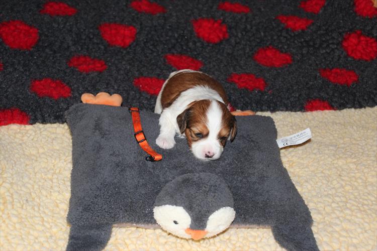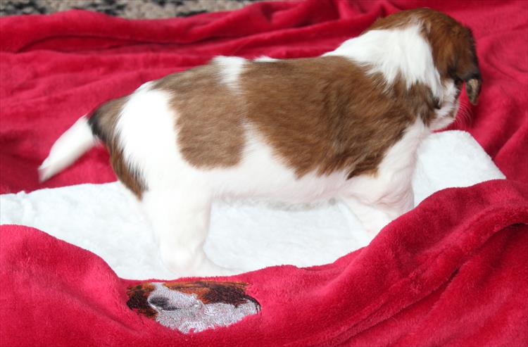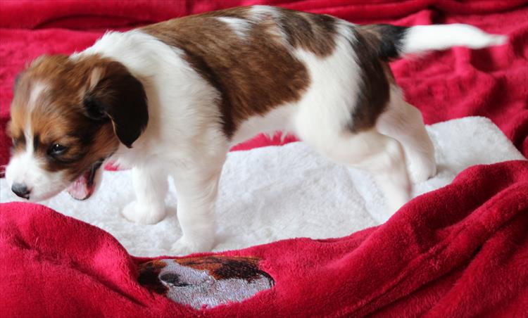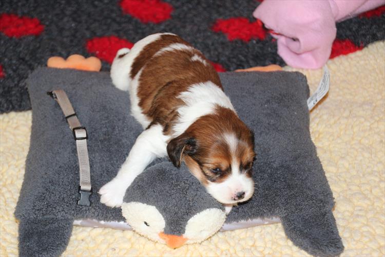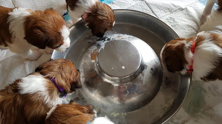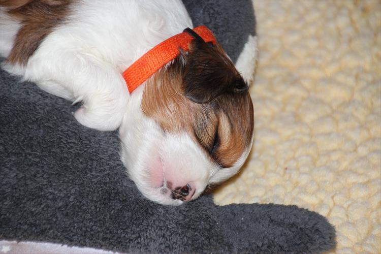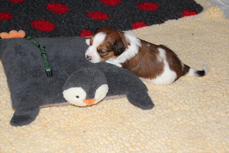 Unsere Zwerge kommen jetzt in die Übergangsphase.(3. Woche). Sie dauert vom Öffnen der Augen 10. bis 14. Lebenstag bis zum vollständigen Öffnen des Gehörganges 13 bis 15. Lebenstag. Das Öffnen der Augen erfolgt vom inneren Augenwinkel. Die Augen sind zunächst trüb. Zuerst werden Bewegungen als Schatten wahrgenommen. Danach verbessert sich das Sehen täglich. Die echte Sehfähigkeit der Augen ist erst um den 17. Lebenstag vorhanden. Das gleiche gilt für das Hören. Die Welpen beginnen jetzt ohne Mutters Hilfe ihre "Geschäfte" zu verrichten. Dabei kann man schon mal umfallen. Die Stimulierung von Harn- und Kotabsatz durch die Mutter geht bis zum 16. Lebenstag. Willkürliche Kontrolle des Harnabsatzes ab dem 21. Lebenstag. Muskelzuckungen während des Schlafes ist bis zum 28. Lebenstag zu beobachten. Die Welpen geben jetzt auch Laute von sich wie ein Quieken, leises Knurren und Bellen. Hauptsächlich sind diese Geräusche im Schlaf zu entdecken. In dieser Phase fällt die Entwicklung einer ersten Form der Stubenreinheit auf. Die Welpen machen regelrecht Terror und versuchen die Wurfkiste zu verlassen. Setzt man sie neben die Kiste, lösen sie sich meist sehr schnell und sind danach in der Kiste wieder ruhig und zufrieden. Es zeigen sich erste soziale Verhaltensweisen wie Schwanzwedeln und Knurren den Geschwistern gegenüber.