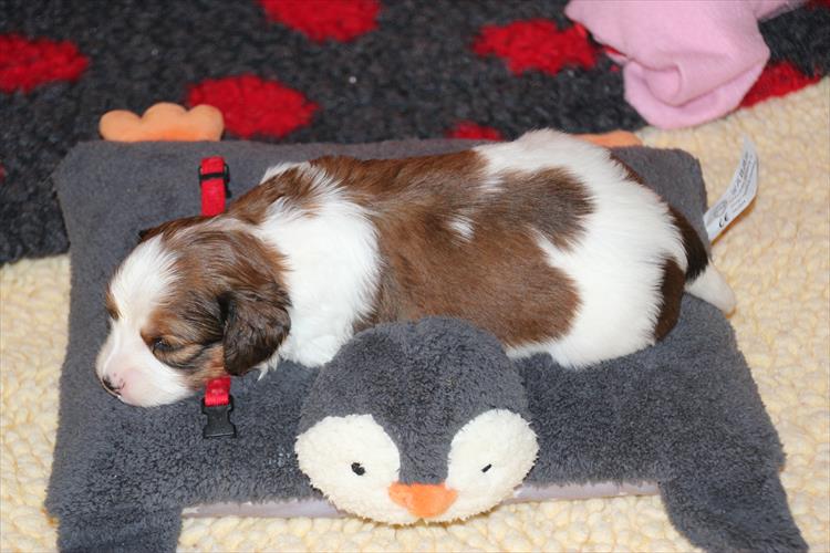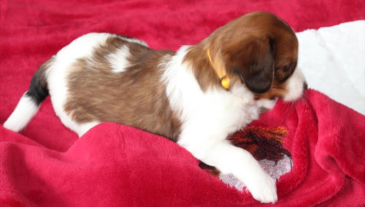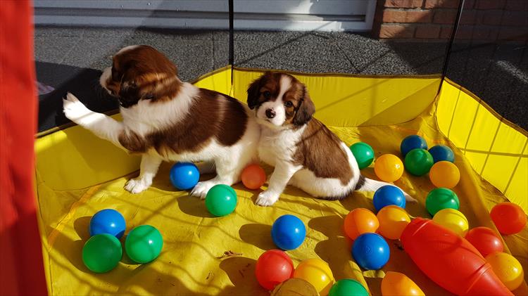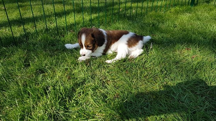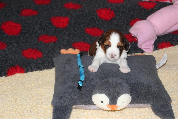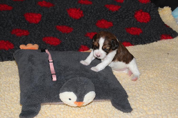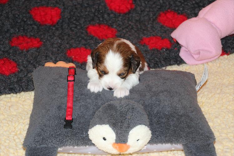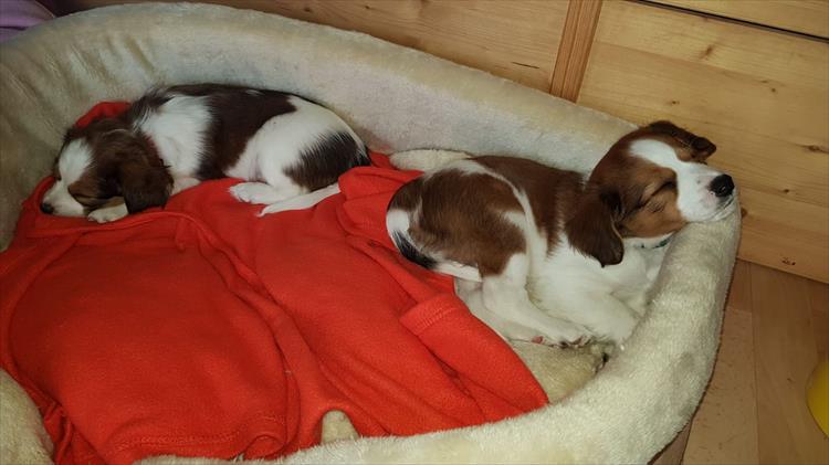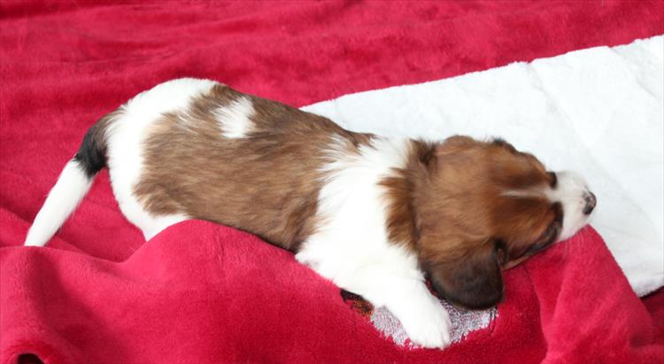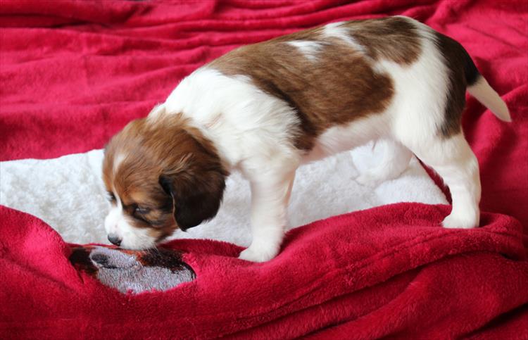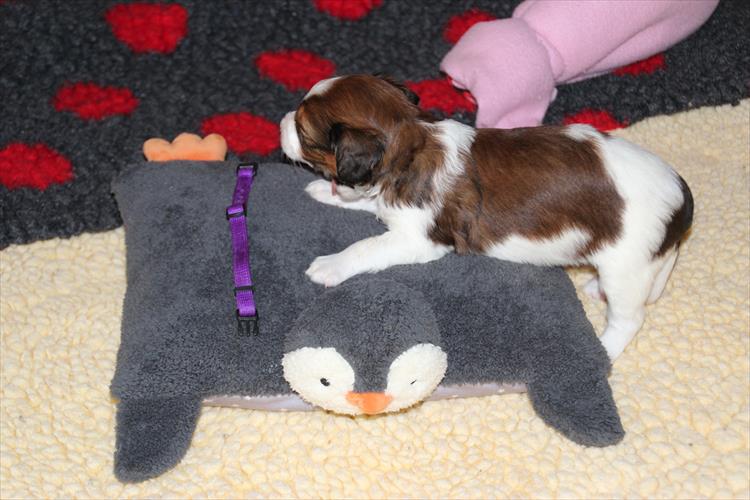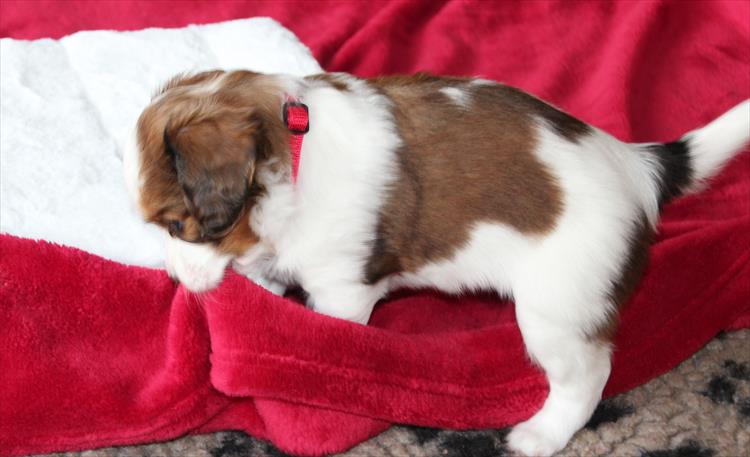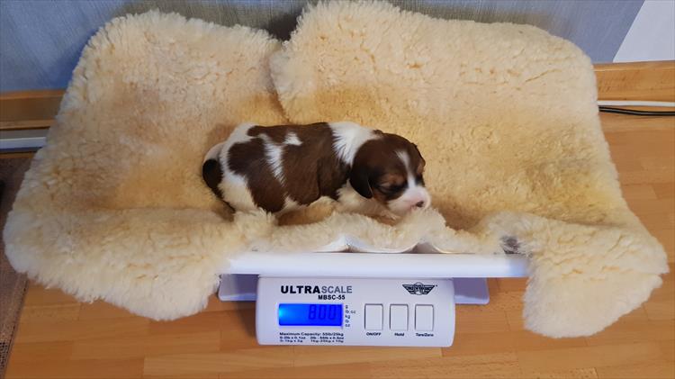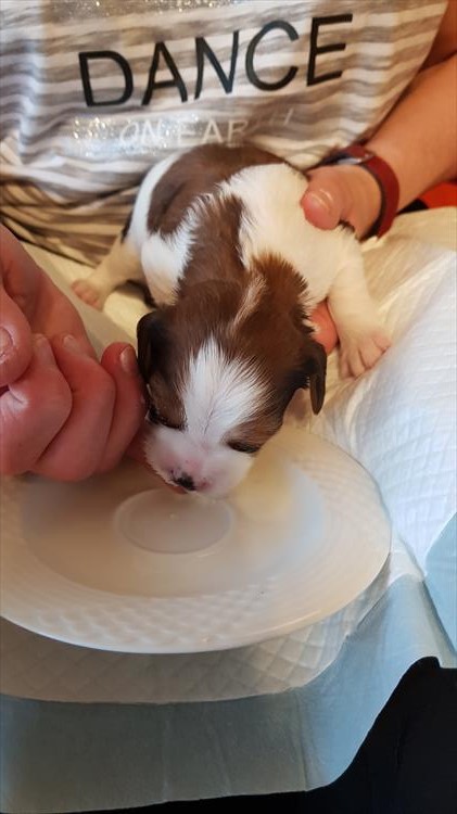 Unsere Zwerge kommen jetzt in die Übergangsphase.(3. Woche). Sie dauert vom Öffnen der Augen 10. bis 14. Lebenstag bis zum vollständigen Öffnen des Gehörganges 13 bis 15. Lebenstag. Das Öffnen der Augen erfolgt vom inneren Augenwinkel. Die Augen sind zunächst trüb. Zuerst werden Bewegungen als Schatten wahrgenommen. Danach verbessert sich das Sehen täglich. Die echte Sehfähigkeit der Augen ist erst um den 17. Lebenstag vorhanden. Das gleiche gilt für das Hören. Die Welpen beginnen jetzt ohne Mutters Hilfe ihre "Geschäfte" zu verrichten. Dabei kann man schon mal umfallen. Die Stimulierung von Harn- und Kotabsatz durch die Mutter geht bis zum 16. Lebenstag. Willkürliche Kontrolle des Harnabsatzes ab dem 21. Lebenstag. Muskelzuckungen während des Schlafes ist bis zum 28. Lebenstag zu beobachten. Die Welpen geben jetzt auch Laute von sich wie ein Quieken, leises Knurren und Bellen. Hauptsächlich sind diese Geräusche im Schlaf zu entdecken. In dieser Phase fällt die Entwicklung einer ersten Form der Stubenreinheit auf. Die Welpen machen regelrecht Terror und versuchen die Wurfkiste zu verlassen. Setzt man sie neben die Kiste, lösen sie sich meist sehr schnell und sind danach in der Kiste wieder ruhig und zufrieden. Es zeigen sich erste soziale Verhaltensweisen wie Schwanzwedeln und Knurren den Geschwistern gegenüber.