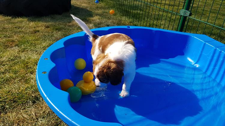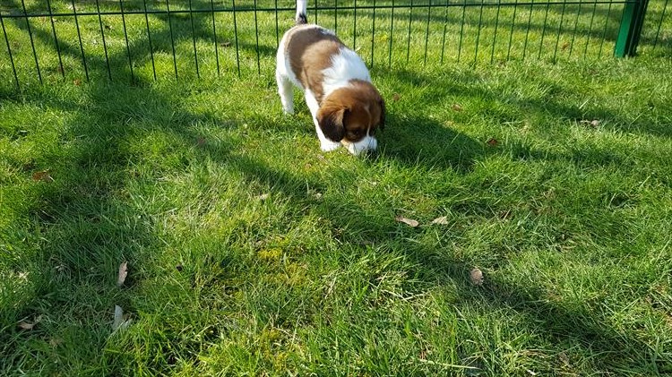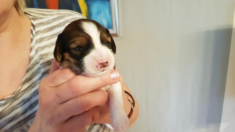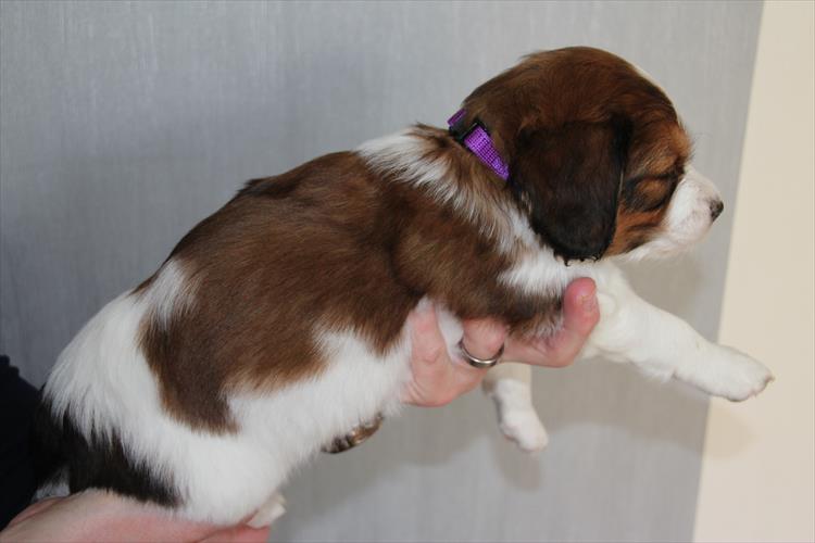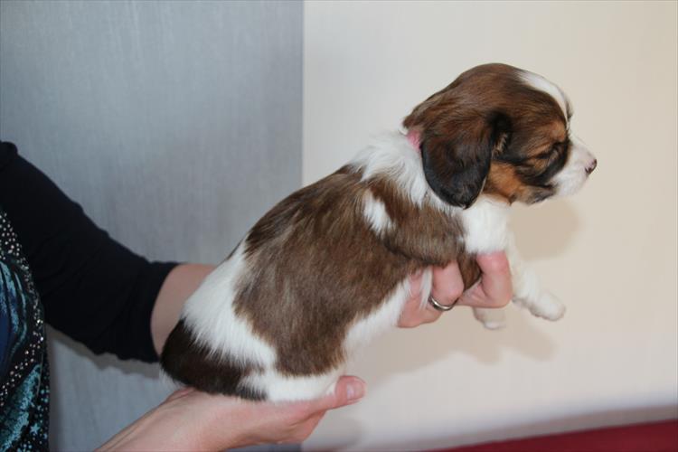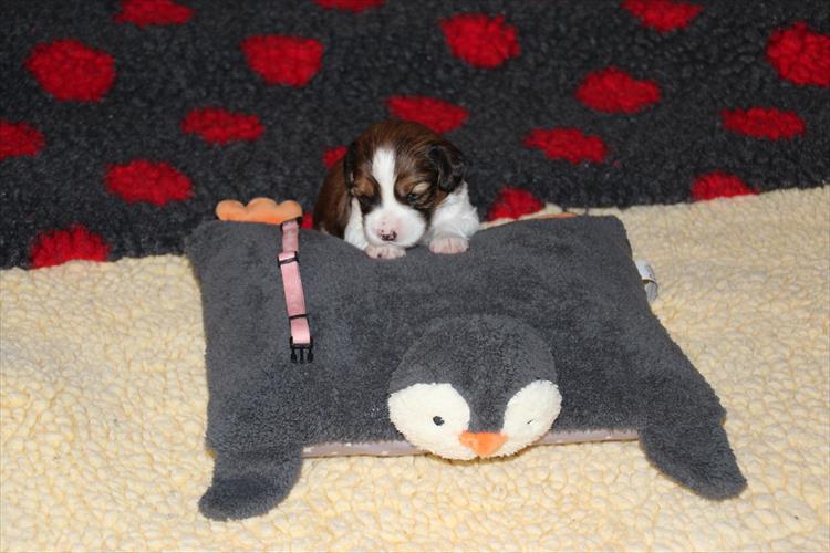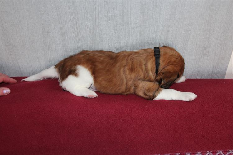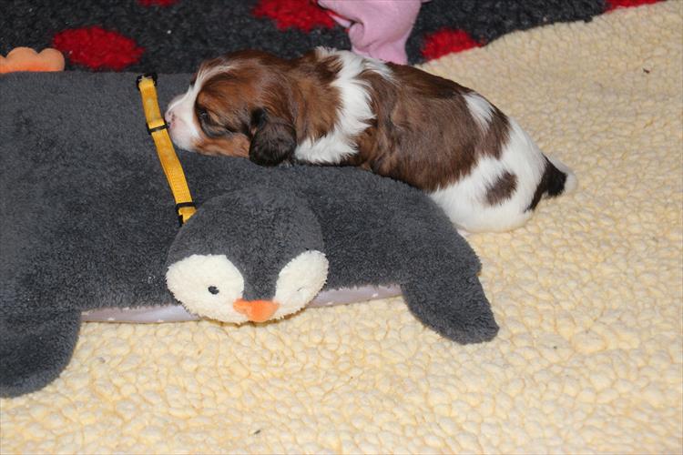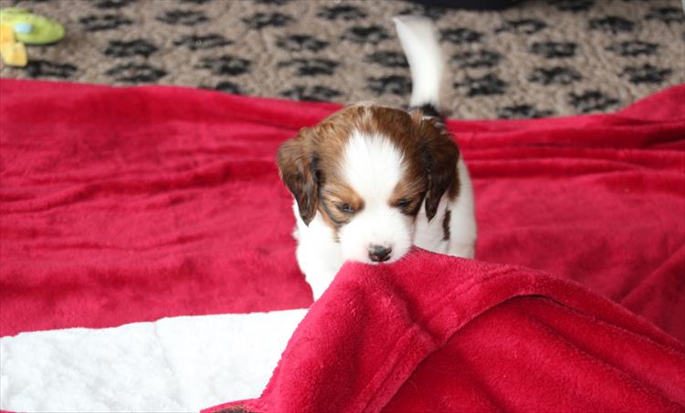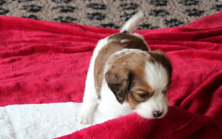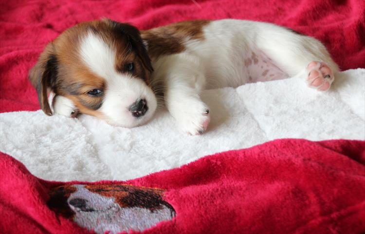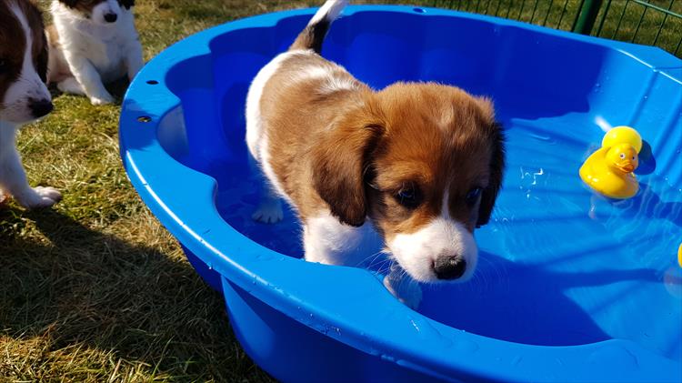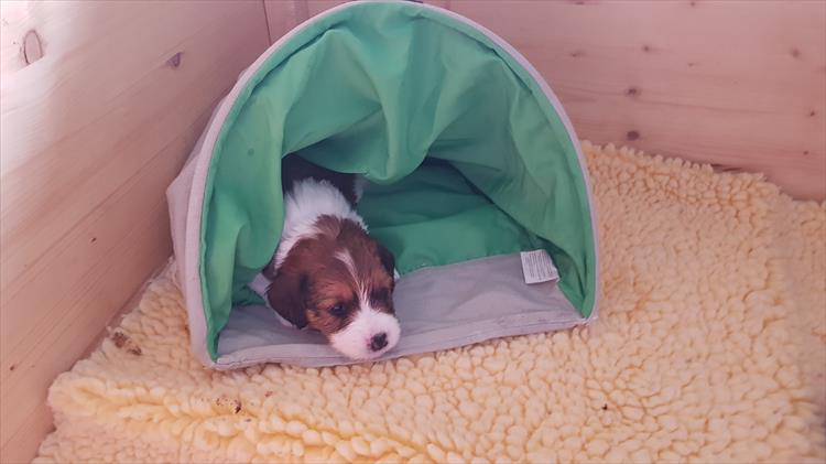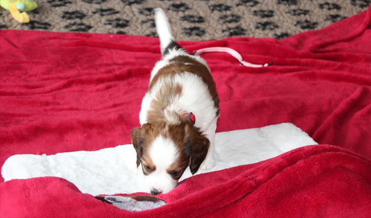Unsere Zwerge kommen jetzt in die Übergangsphase.(3. Woche). Sie dauert vom Öffnen der Augen 10. bis 14. Lebenstag bis zum vollständigen Öffnen des Gehörganges 13 bis 15. Lebenstag. Das Öffnen der Augen erfolgt vom inneren Augenwinkel. Die Augen sind zunächst trüb. Zuerst werden Bewegungen als Schatten wahrgenommen. Danach verbessert sich das Sehen täglich. Die echte Sehfähigkeit der Augen ist erst um den 17. Lebenstag vorhanden. Das gleiche gilt für das Hören. Die Welpen beginnen jetzt ohne Mutters Hilfe ihre "Geschäfte" zu verrichten. Dabei kann man schon mal umfallen. Die Stimulierung von Harn- und Kotabsatz durch die Mutter geht bis zum 16. Lebenstag. Willkürliche Kontrolle des Harnabsatzes ab dem 21. Lebenstag. Muskelzuckungen während des Schlafes ist bis zum 28. Lebenstag zu beobachten. Die Welpen geben jetzt auch Laute von sich wie ein Quieken, leises Knurren und Bellen. Hauptsächlich sind diese Geräusche im Schlaf zu entdecken. In dieser Phase fällt die Entwicklung einer ersten Form der Stubenreinheit auf. Die Welpen machen regelrecht Terror und versuchen die Wurfkiste zu verlassen. Setzt man sie neben die Kiste, lösen sie sich meist sehr schnell und sind danach in der Kiste wieder ruhig und zufrieden. Es zeigen sich erste soziale Verhaltensweisen wie Schwanzwedeln und Knurren den Geschwistern gegenüber.
