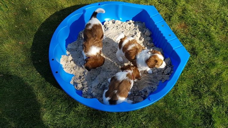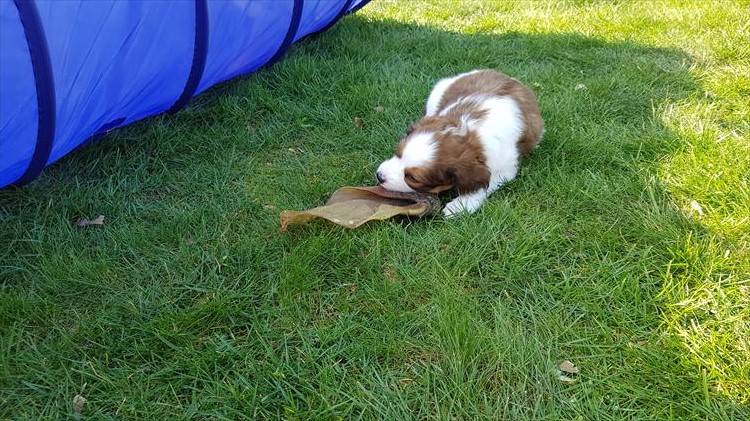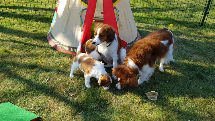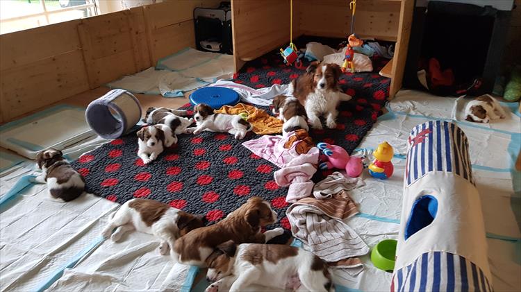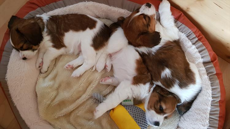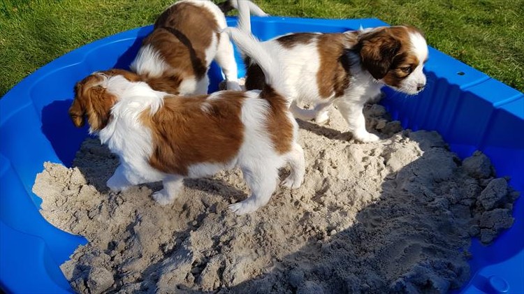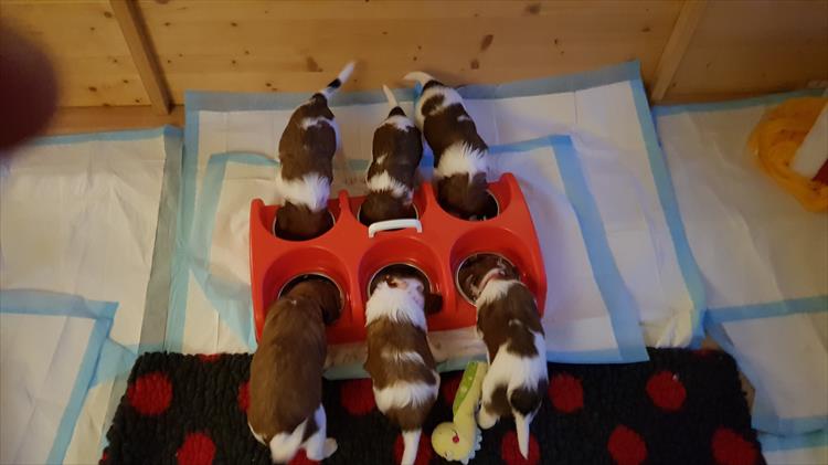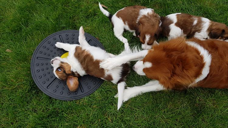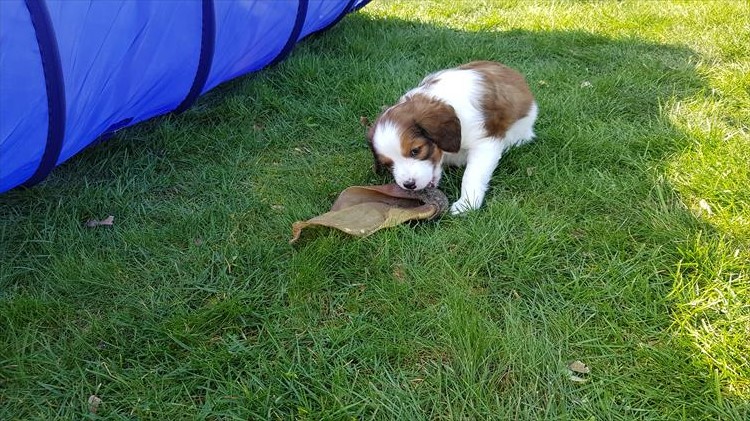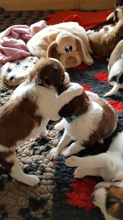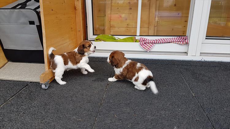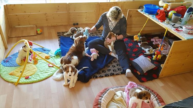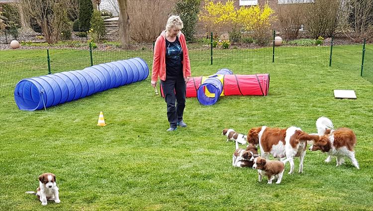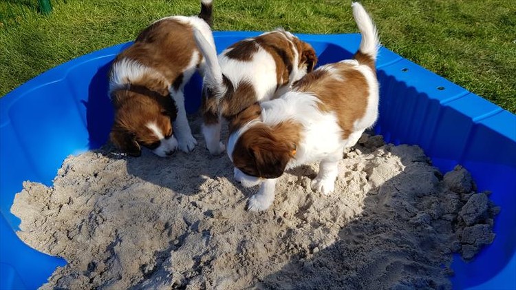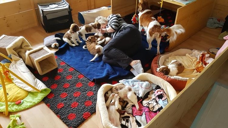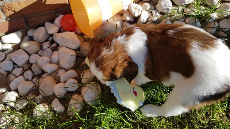 Unsere Zwerge sind jetzt in der Sozialisationsphase (4. bis 16. Lebenswoche). In dieser Phase werden die Welpen intensiv auf seine Geschwister und vor allem auf den Menschen geprägt (Prägungsphase). Sie lernen auf spielerische Weise den Umgang mit ihren Geschwistern. Sie springen, knurren, fordern zum Spiel auf, unterwerfen sich, quietschen und schreien. Sie entdecken, erkunden, untersuchen, laufen, rempeln und rangeln in den immer länger werdenden Wachphasen. Im Spiel lernen sie Stärken und Schwächen des Spielpartners kennen. Die Sinnesleistungen und der Bewegungsapparat funktionieren schon recht gut. Die Kleinen gehen zeitweise recht rabiat miteinander um. Wenn mal einer zu weit gegangen ist, folgen prompt lautstarkes Geschrei und Protest. Daraus lernen die Welpen wie weit sie gehen können, bevor es weh tut. Das führt zu ersten sozialen Lerneffekten und begründet die Entstehung und Ausbildung einer Beißhemmung. Beißhemmung muss gelernt werden und das geschieht sehr früh innerhalb der Geschwisterschar und im Umgang mit der Mutter. Welpen wissen, wie man zubeißt, aber nicht wie heftig und wann man wieder los lässt. Die Lernmethode ist relativ einfach: Bist du zu rabiat, dann geh ich weg von dir und du bist allein!