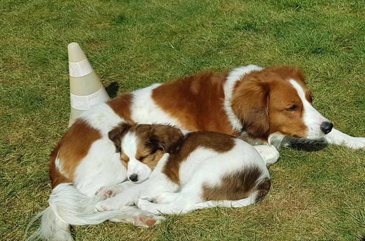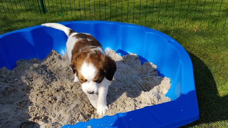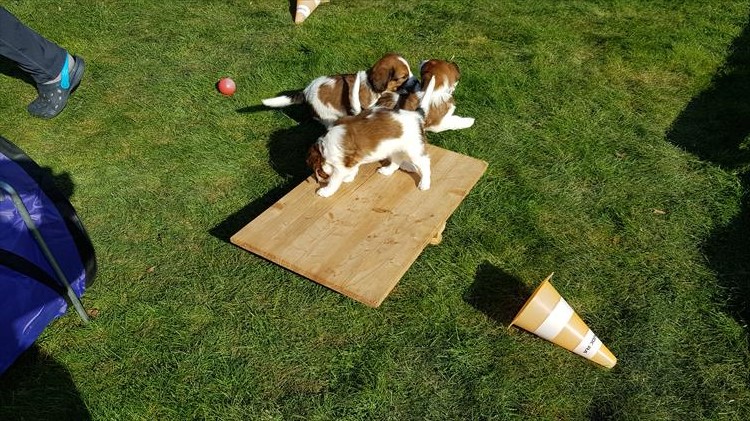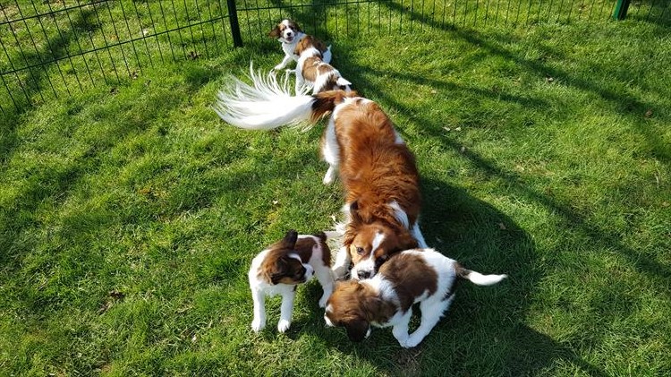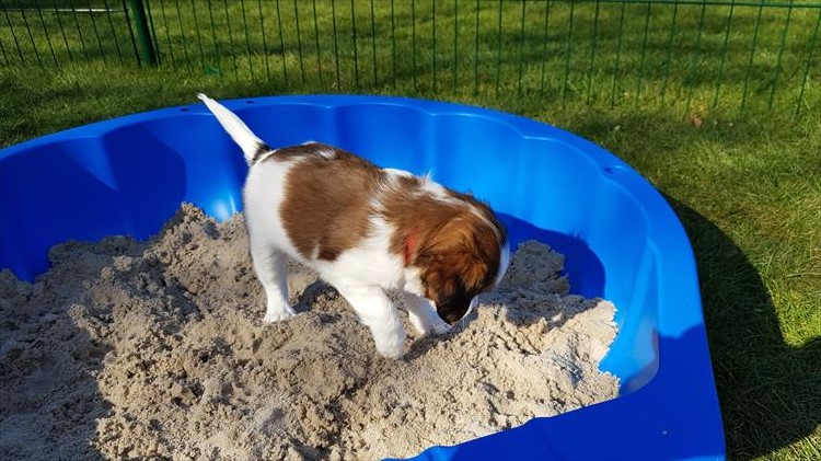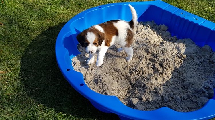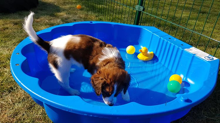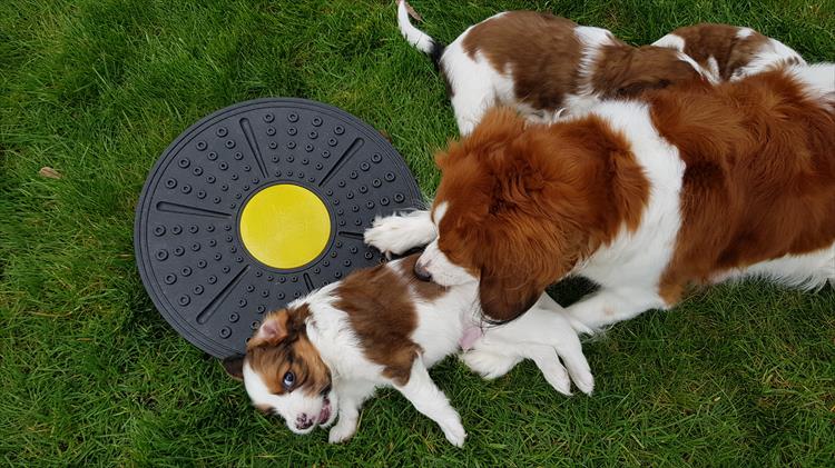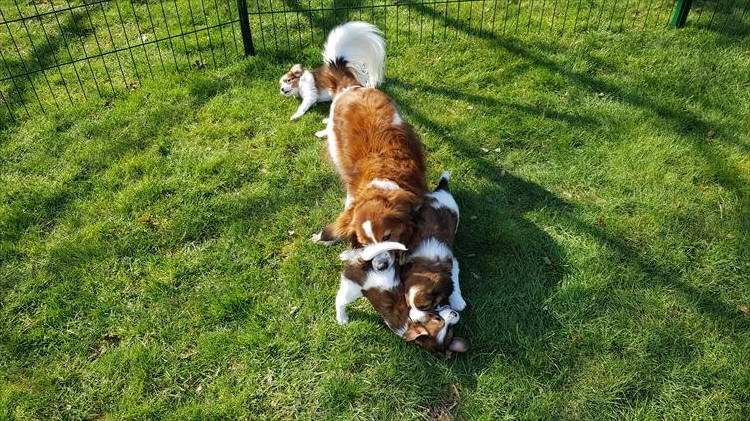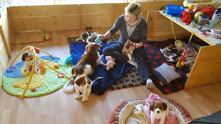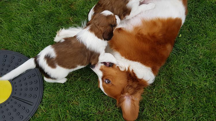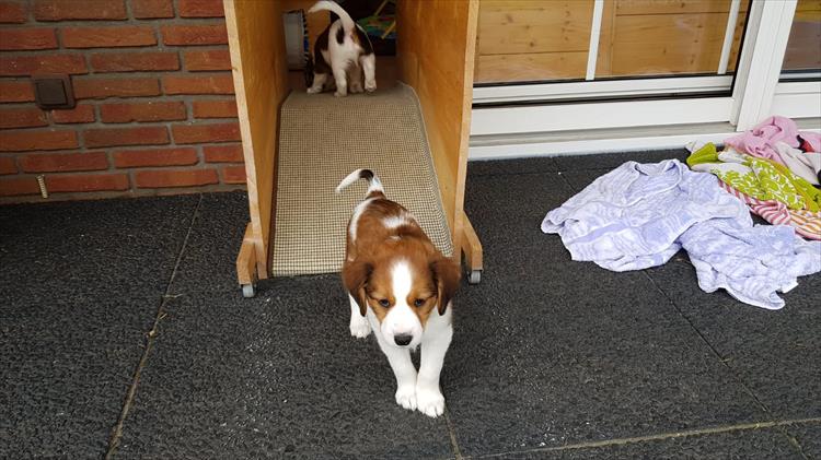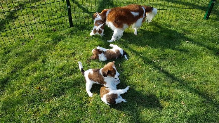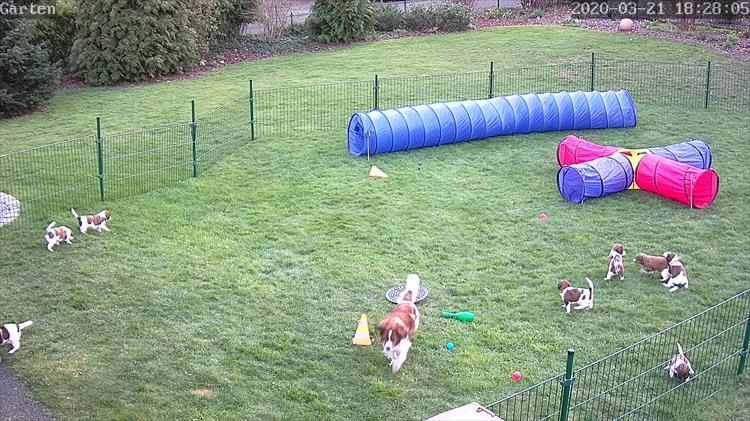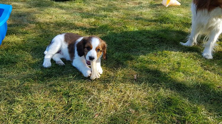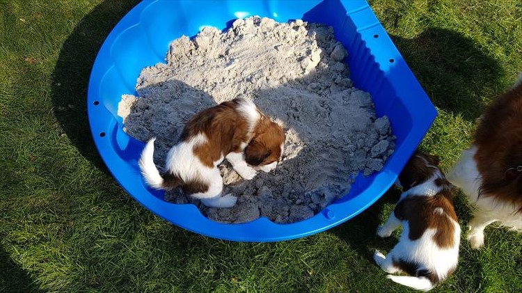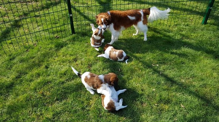Unsere Zwerge sind jetzt in der Sozialisationsphase (4. bis 16. Lebenswoche). In dieser Phase werden die Welpen intensiv auf seine Geschwister und vor allem auf den Menschen geprägt (Prägungsphase). Sie lernen auf spielerische Weise den Umgang mit ihren Geschwistern. Sie springen, knurren, fordern zum Spiel auf, unterwerfen sich, quietschen und schreien. Sie entdecken, erkunden, untersuchen, laufen, rempeln und rangeln in den immer länger werdenden Wachphasen. Im Spiel lernen sie Stärken und Schwächen des Spielpartners kennen. Die Sinnesleistungen und der Bewegungsapparat funktionieren schon recht gut. Die Kleinen gehen zeitweise recht rabiat miteinander um. Wenn mal einer zu weit gegangen ist, folgen prompt lautstarkes Geschrei und Protest. Daraus lernen die Welpen wie weit sie gehen können, bevor es weh tut. Das führt zu ersten sozialen Lerneffekten und begründet die Entstehung und Ausbildung einer Beißhemmung. Beißhemmung muss gelernt werden und das geschieht sehr früh innerhalb der Geschwisterschar und im Umgang mit der Mutter. Welpen wissen, wie man zubeißt, aber nicht wie heftig und wann man wieder los lässt. Die Lernmethode ist relativ einfach: Bist du zu rabiat, dann geh ich weg von dir und du bist allein!