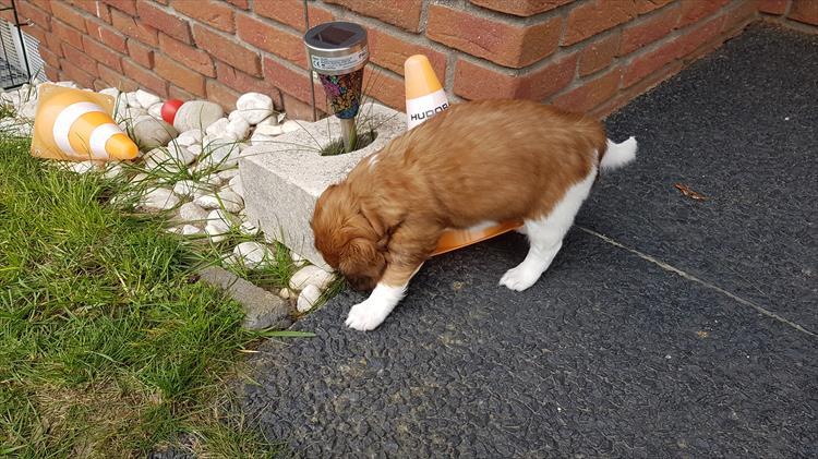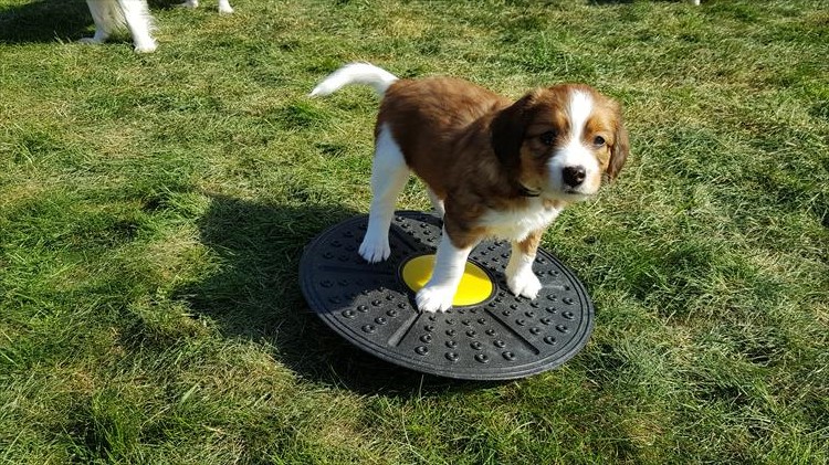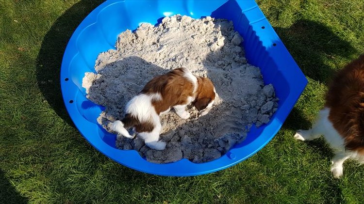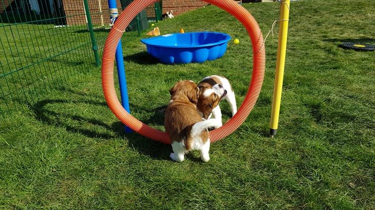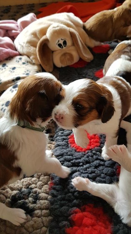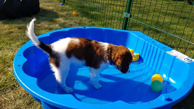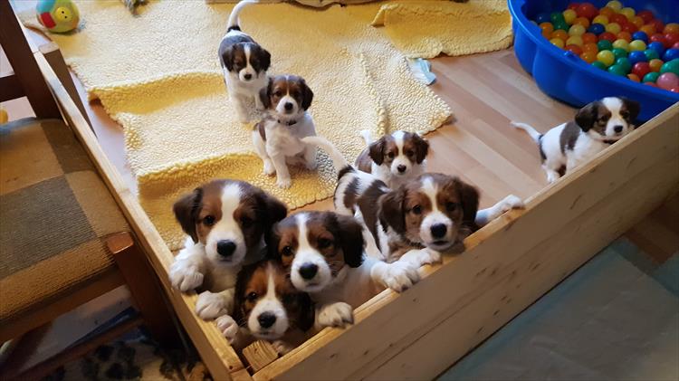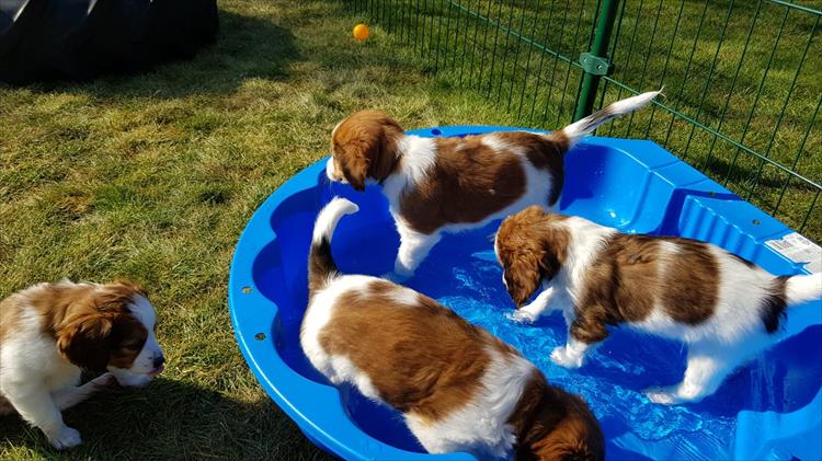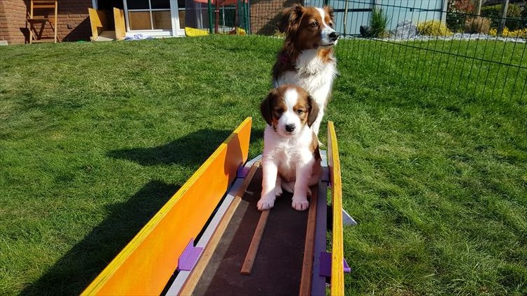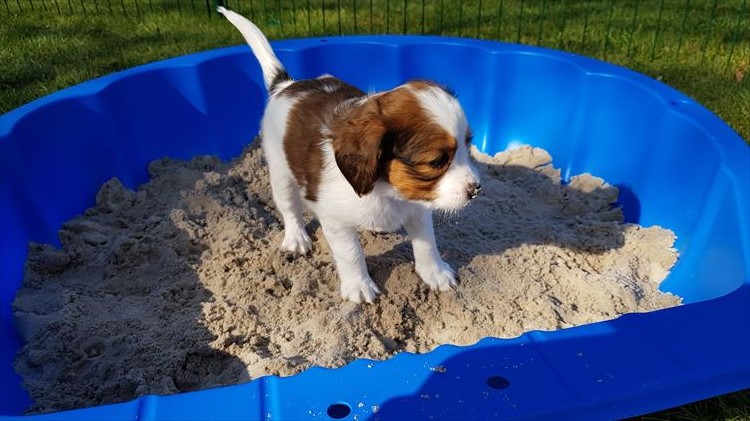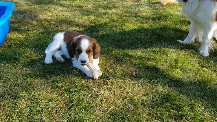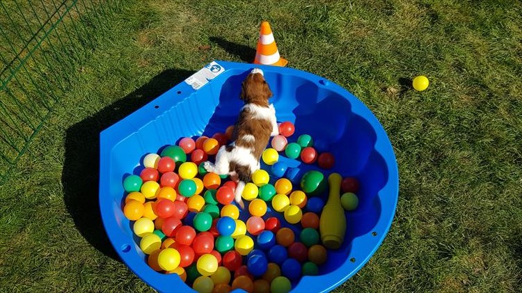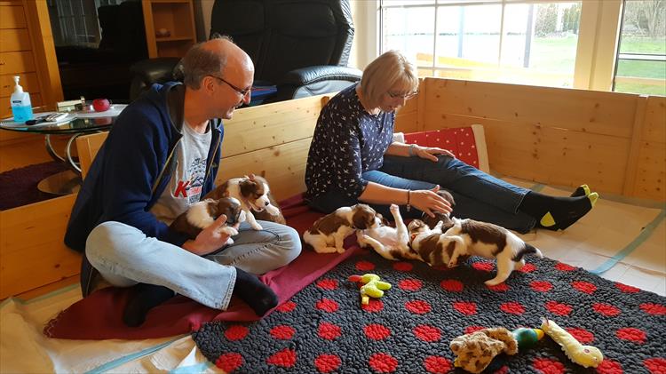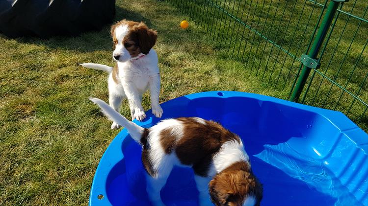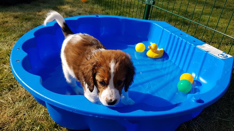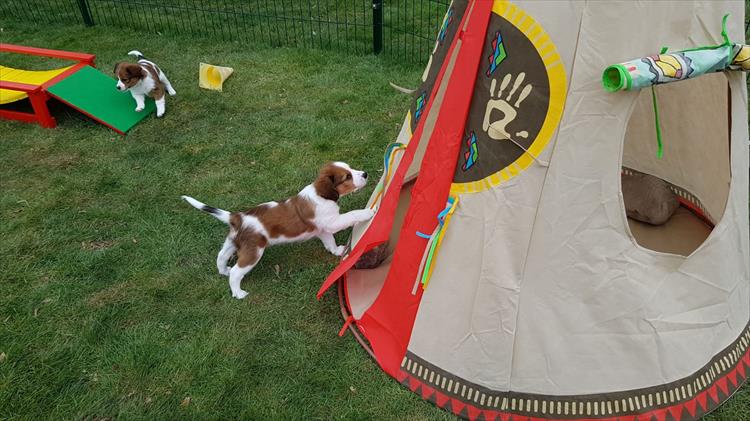 Unsere Zwerge sind jetzt in der Sozialisationsphase (4. bis 16. Lebenswoche). In dieser Phase werden die Welpen intensiv auf seine Geschwister und vor allem auf den Menschen geprägt (Prägungsphase). Sie lernen auf spielerische Weise den Umgang mit ihren Geschwistern. Sie springen, knurren, fordern zum Spiel auf, unterwerfen sich, quietschen und schreien. Sie entdecken, erkunden, untersuchen, laufen, rempeln und rangeln in den immer länger werdenden Wachphasen. Im Spiel lernen sie Stärken und Schwächen des Spielpartners kennen. Die Sinnesleistungen und der Bewegungsapparat funktionieren schon recht gut. Die Kleinen gehen zeitweise recht rabiat miteinander um. Wenn mal einer zu weit gegangen ist, folgen prompt lautstarkes Geschrei und Protest. Daraus lernen die Welpen wie weit sie gehen können, bevor es weh tut. Das führt zu ersten sozialen Lerneffekten und begründet die Entstehung und Ausbildung einer Beißhemmung. Beißhemmung muss gelernt werden und das geschieht sehr früh innerhalb der Geschwisterschar und im Umgang mit der Mutter. Welpen wissen, wie man zubeißt, aber nicht wie heftig und wann man wieder los lässt. Die Lernmethode ist relativ einfach: Bist du zu rabiat, dann geh ich weg von dir und du bist allein!