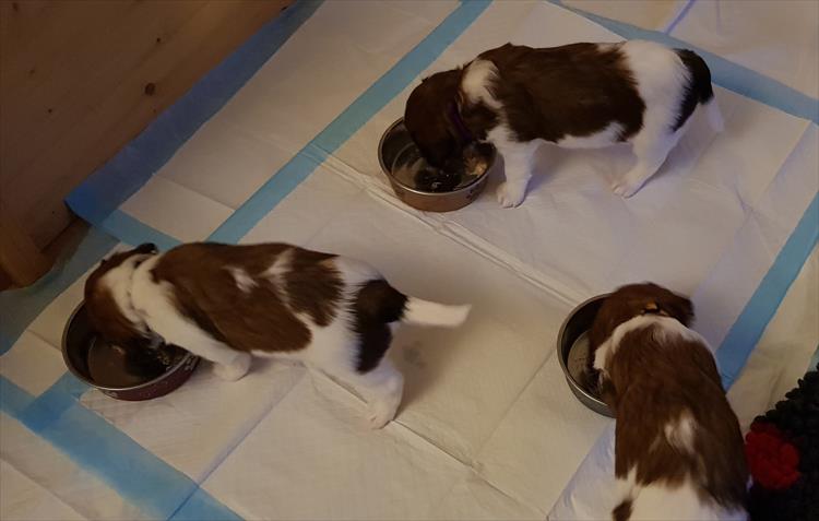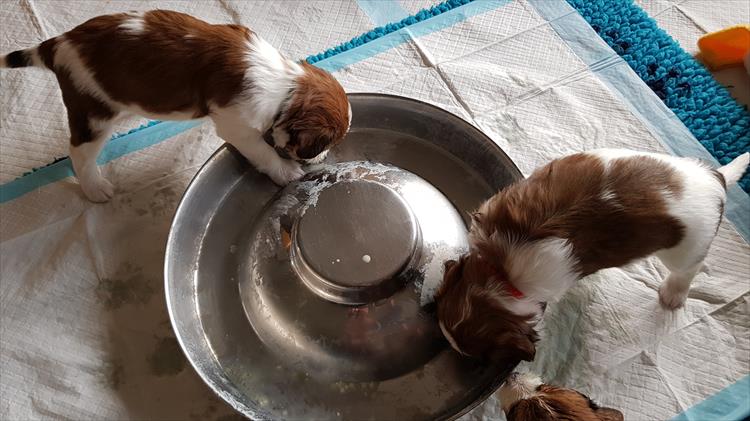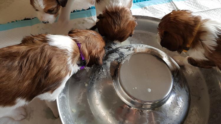 Ab dem 20. Tag gibt es leckeren Fleischbrei, um Dreamy weiter zu entlasten. Nach einigen Übungsversuchen können unsere F-Wölkchen selbstständig ihren Brei geniessen.