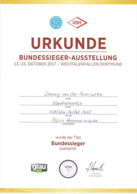 Wir hatten ein erfolgreiches Wochenende! Dreamy erhielt in der Zwischenklasse von der Richterin Menges-Mohr V1 (Vorzüglich, Platz 1), Beste Hündin (BOS) und den Titel Bundessieger 2017.