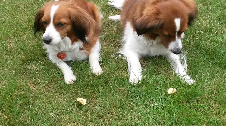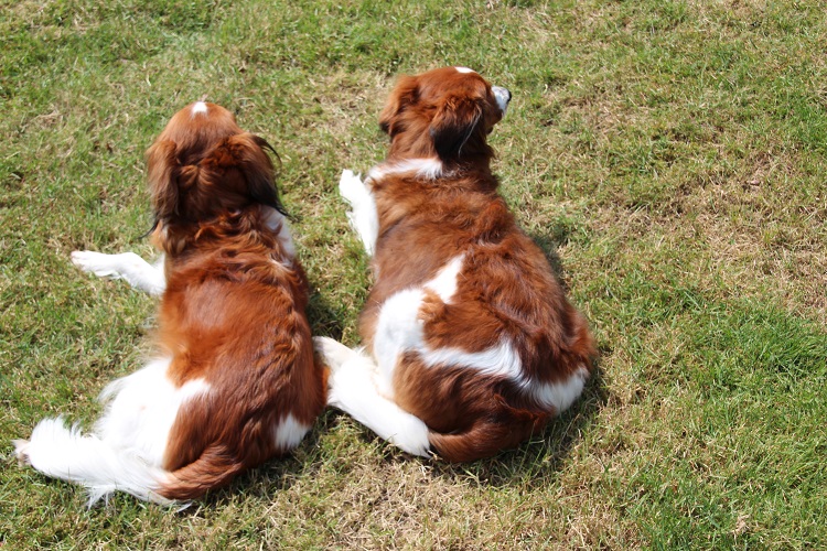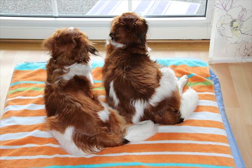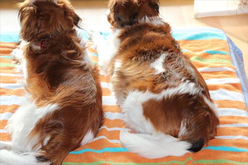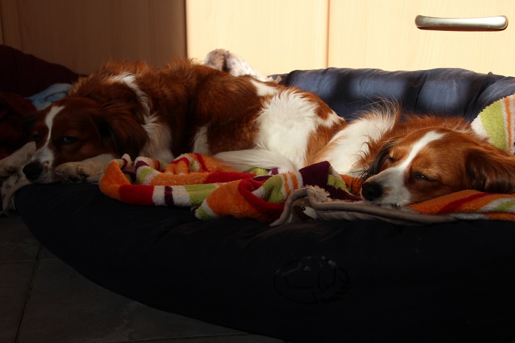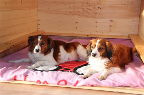 Roxy und Xalli genießen vor der Wurfkiste die Sonne.