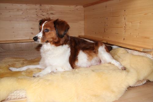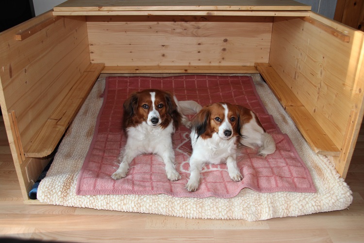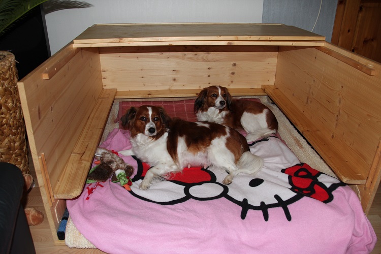 Die Welpenkiste ist im Wohnzimmer aufgebaut. Roxy findet ihre "Höhle" extrem ok. Roxy und Xalli haben dort gleich ihren Platz gefunden und genießen die Sonne.