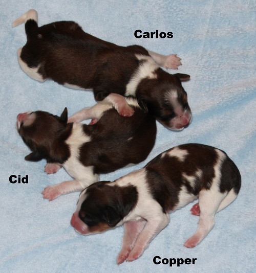 Das Geschlecht ist bestimmbar. Die Fellfarbe beginnt sich zu entwickeln. Der Herzschlag der Welpen ist durch Stetoskop hörbar. Die Zitzen von Roxy werden dunkler und schwellen an.